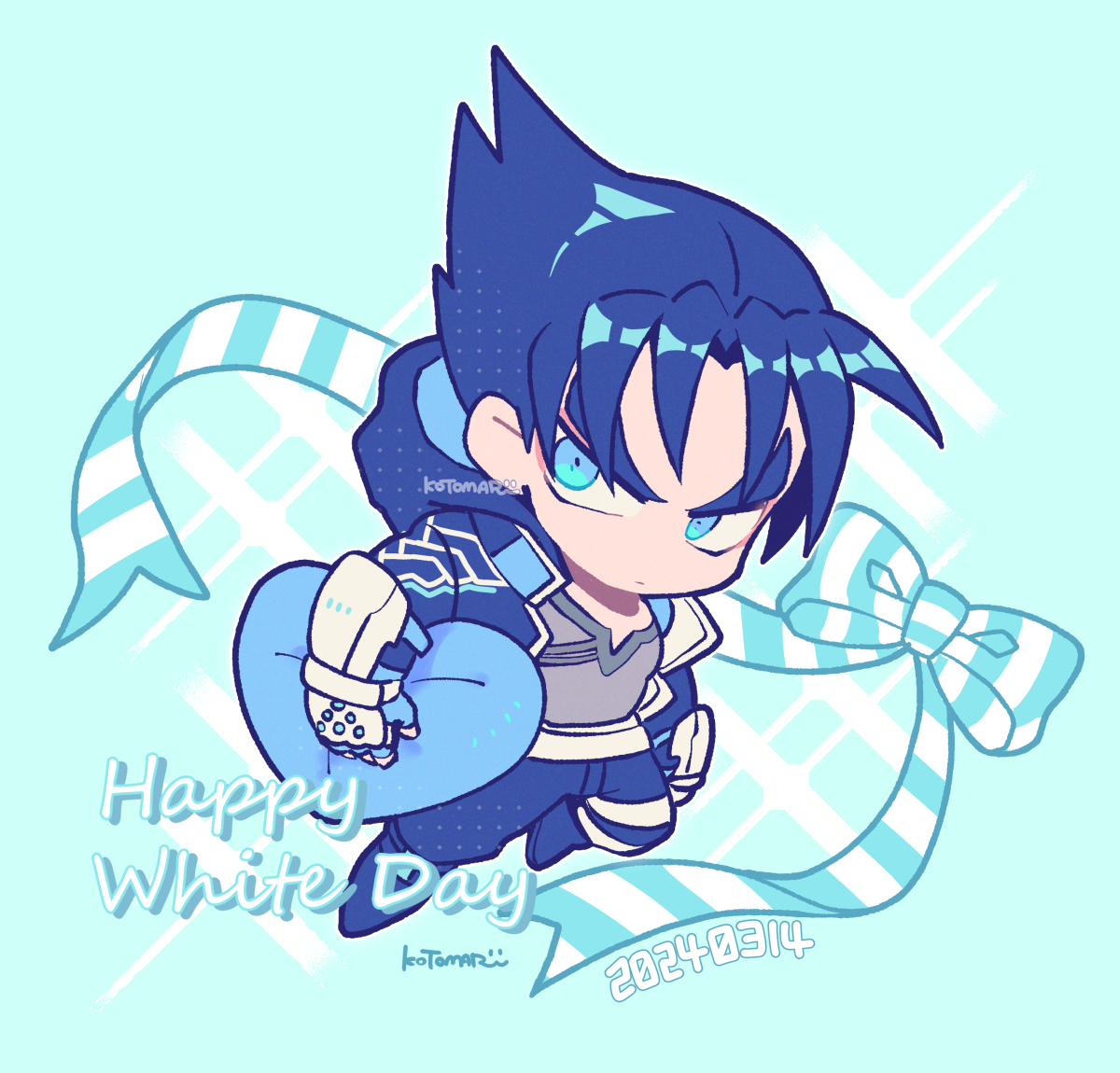 1boy blue_eyes blue_hair blue_jacket blue_pants chibi chibi_only closed_mouth dated fingerless_gloves full_body gloves grey_shirt heart heart-shaped_pillow hood hood_down hooded_jacket jacket kazama_jin kotomaru_(kotokoto_kottan) limited_palette looking_at_viewer male_focus no_nose pants pillow ribbon shirt short_hair signature solo striped_ribbon studded_gloves tekken v-shaped_eyebrows white_day