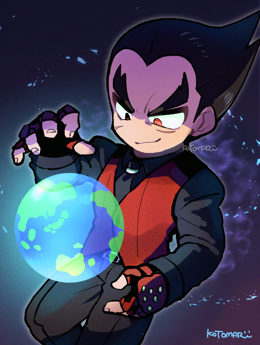 1boy belt black_belt black_eyes black_hair black_necktie black_pants black_shirt closed_mouth collared_shirt earth_(planet) facial_scar fingerless_gloves fingernails gloves heterochromia highres hologram kotomaru_(kotokoto_kottan) long_sleeves male_focus mishima_kazuya necktie no_nose pants planet red_eyes red_gloves red_vest scar scar_on_cheek scar_on_face shirt sideburns signature solo studded_gloves tekken tekken_8 v-shaped_eyebrows vest
