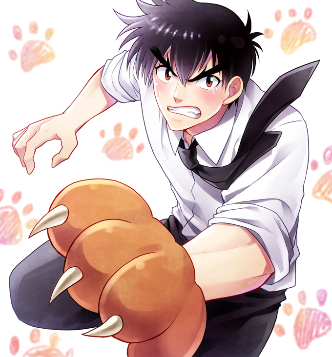 1boy animal_hands black_hair black_necktie black_pants blush brown_eyes claws collared_shirt gloves grimace jigoku_sensei_nube jin_akhr looking_at_viewer male_focus necktie nueno_meisuke pants paw_gloves paw_print shirt solo tears v-shaped_eyebrows white_shirt