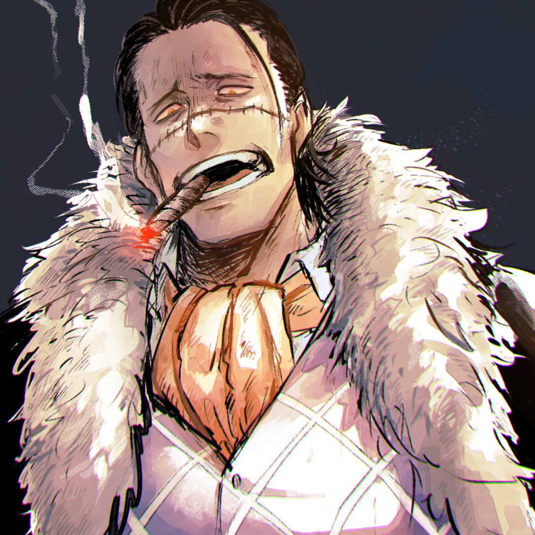 1boy ascot black_background black_coat black_hair cigar coat commentary crocodile_(one_piece) english_commentary fur-trimmed_coat fur_trim hair_slicked_back looking_down male_focus medium_hair musubi_rolling one_piece open_mouth orange_ascot orange_eyes patterned_clothing scar scar_on_face smoke smoke_trail smoking solo teeth upper_body vest white_fur