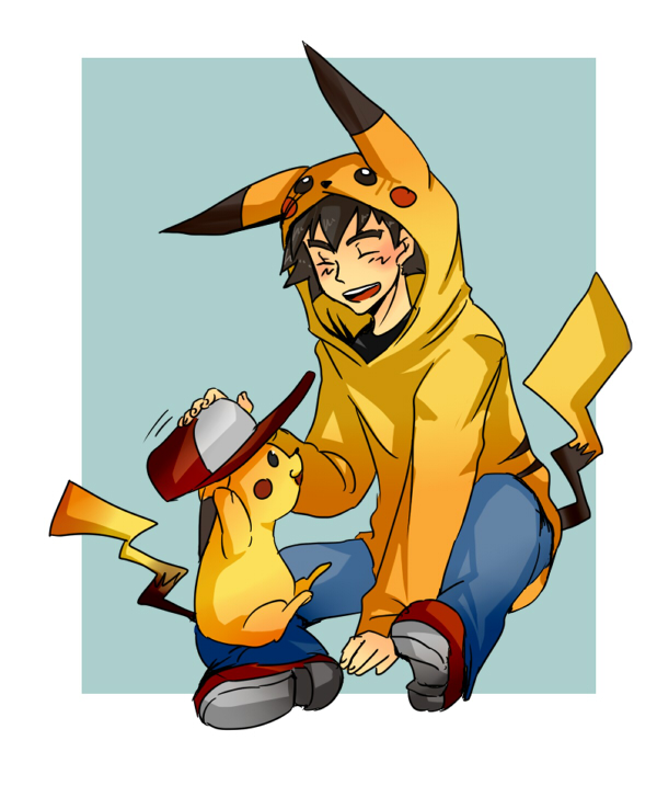 1boy ash_ketchum baseball_cap blush cosplay facial_mark gen_1_pokemon hanawo_(slumpcat) hat hood hoodie male_focus nintendo open_mouth pikachu pikachu_(cosplay) pokemon pokemon_(anime) pokemon_(classic_anime) pokemon_(creature) sitting smile