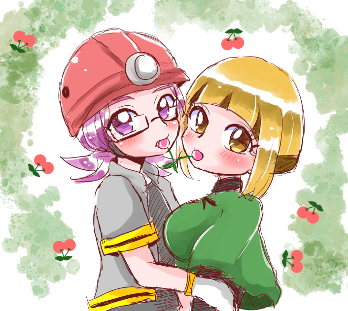 1boy 1girl blush breasts brown_eyes brown_hair cherry couple food fruit gardenia_(pokemon) glasses hat helmet hetero jacket looking_at_viewer mouth_hold nintendo pink_eyes pink_hair pokemon pokemon_diamond/pearl/platinum roark_(pokemon) short_hair sidelocks yukarinrice