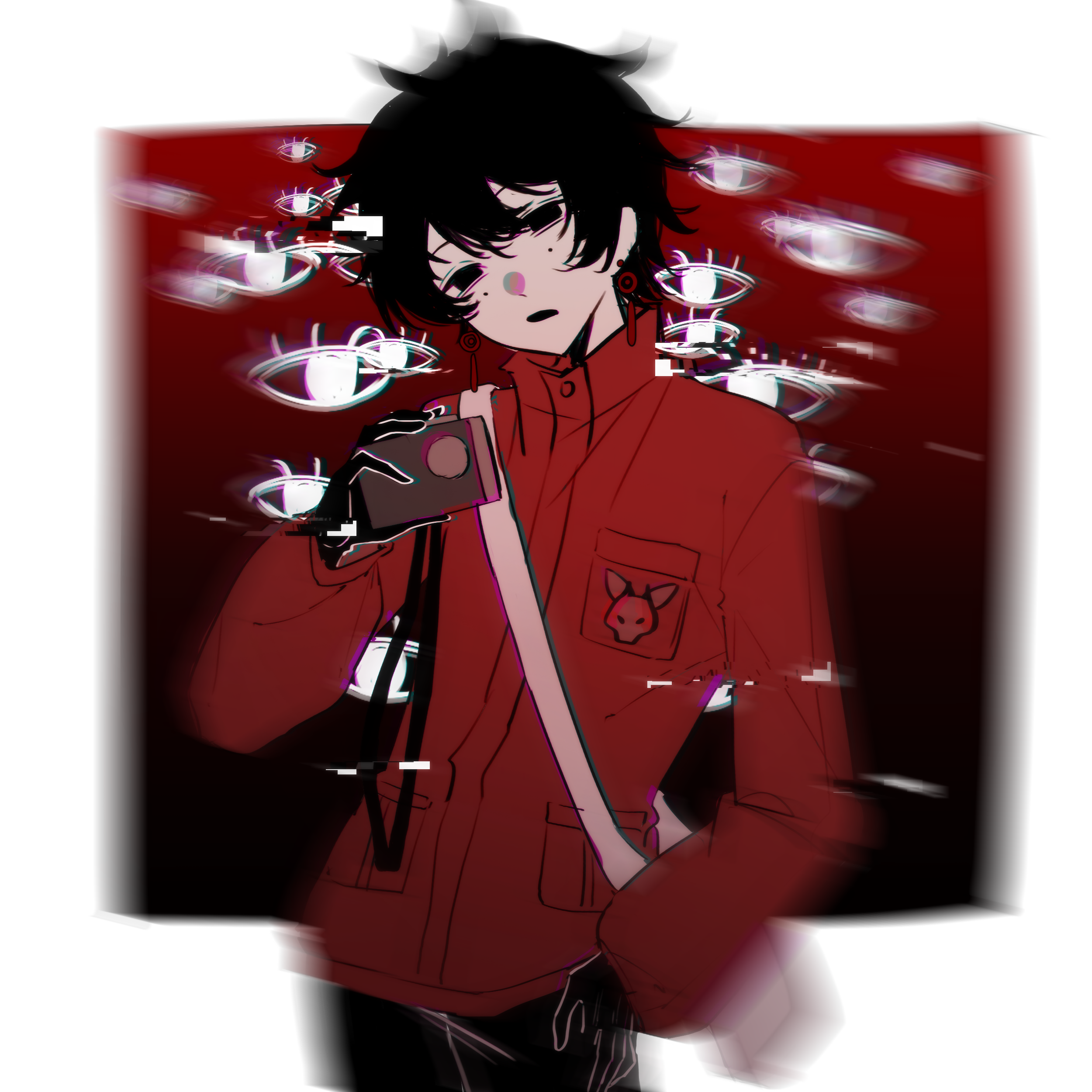 1boy absurdres black_eyes black_gloves black_hair black_pants blurry border camera chinese_commentary commentary_request cowboy_shot disembodied_eye earrings gloves hair_between_eyes hand_on_own_thigh head_tilt high_collar highres holding holding_camera jacket jewelry li_yuting_(male) male_focus mole mole_under_each_eye mole_under_eye multiple_moles open_mouth outside_border pants red_jacket short_hair solo touqi_guaitan white_border youhuann
