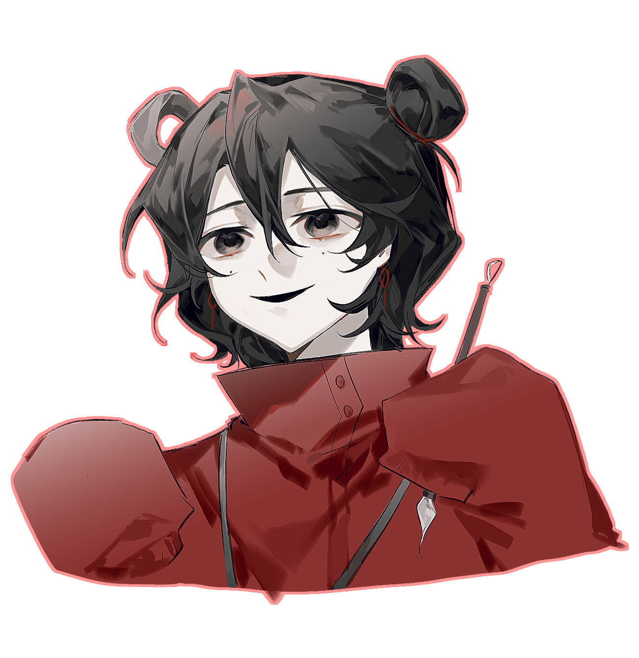 1girl black_eyes black_hair chinese_commentary commentary_request cropped_shoulders earrings hair_between_eyes hair_bun hair_rings high_collar highres holding holding_pen jacket jewelry li_yuting_(female) lingwangosmund long_sleeves mole mole_under_each_eye mole_under_eye multiple_moles open_mouth outline pale_skin pen red_jacket red_outline short_hair single_hair_bun single_hair_ring sleeves_past_fingers sleeves_past_wrists smile solo touqi_guaitan variant_set