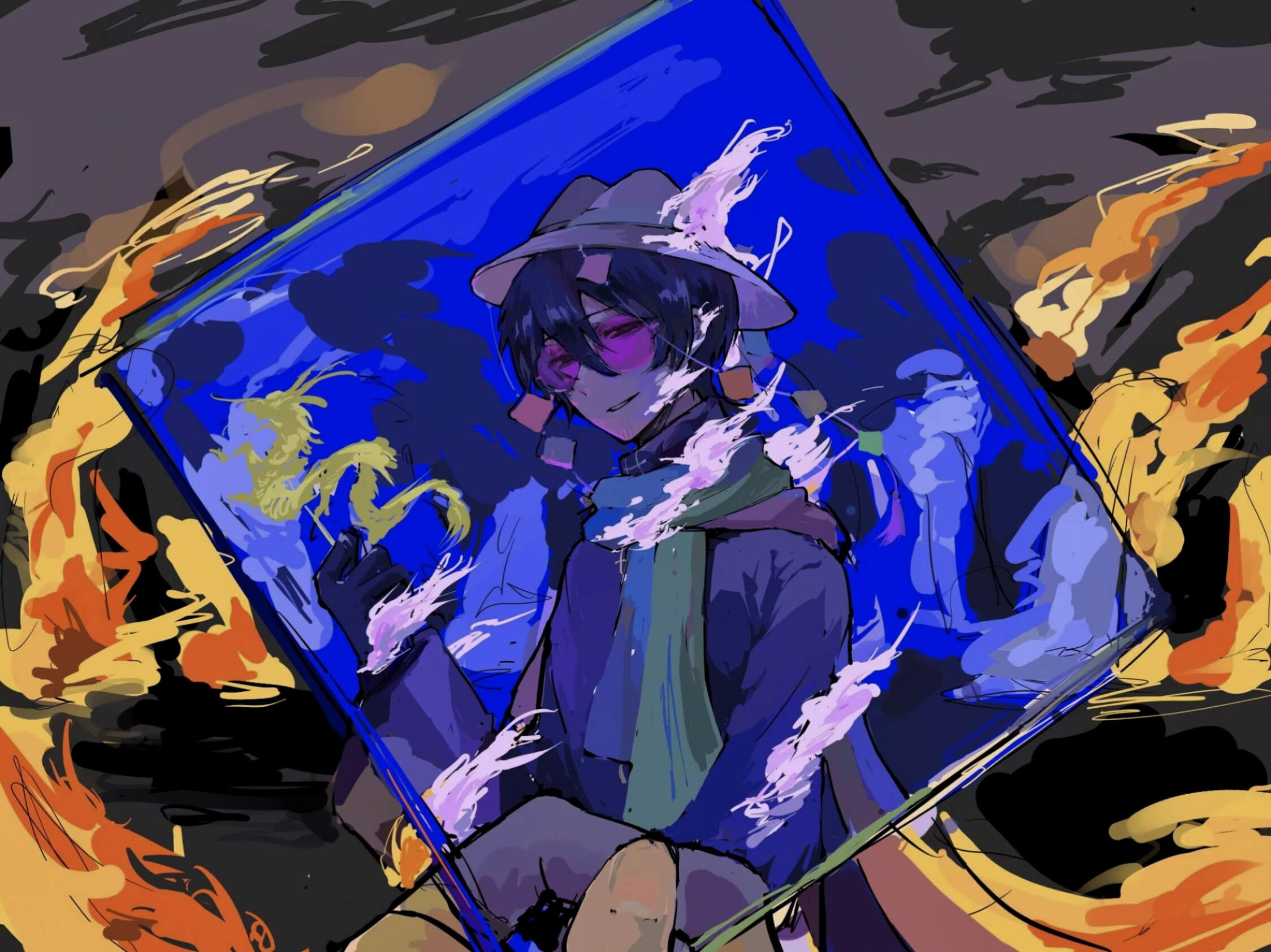 2boys black_hair black_shirt burning chinese_commentary closed_mouth commentary_request fire grey_hat hat highres holding huai_yunqing long_sleeves male_focus multicolored_scarf multiple_boys nzzzzzzz-ji pink-tinted_eyewear round_eyewear scarf shirt short_hair smile solo_focus tinted_eyewear touqi_guaitan upper_body ziche_fuzhao