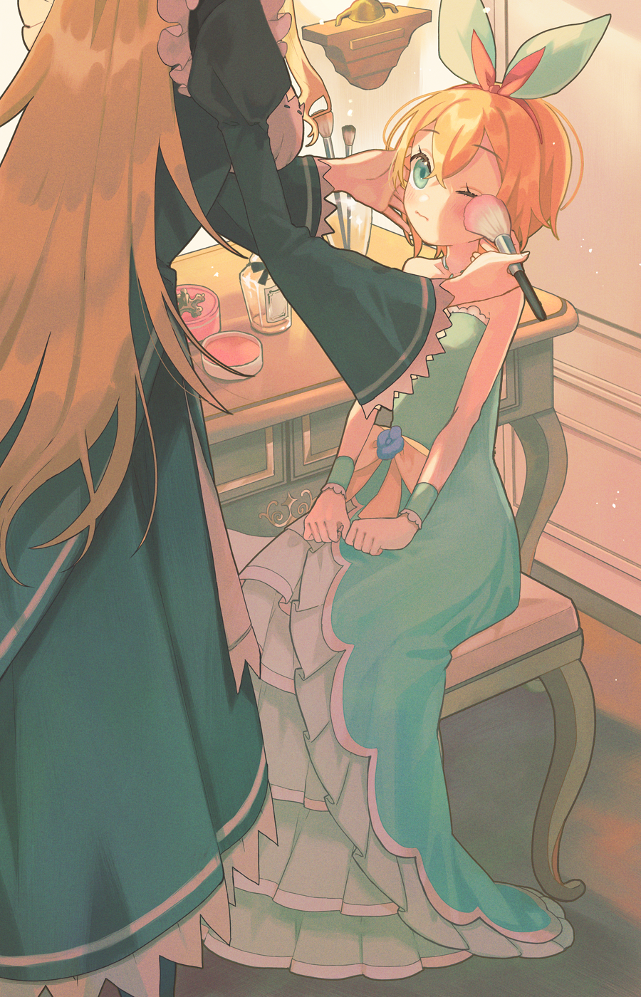 2girls applying_makeup blonde_hair closed_mouth commentary_request dress eyelashes frederica_baumann frills green_dress hair_between_eyes hair_ribbon hairband hands_on_lap highres holding indoors long_hair long_sleeves makeup_brush multiple_girls one_eye_closed orange_hair parupin petra_leyte re:zero_kara_hajimeru_isekai_seikatsu ribbon short_hair sitting stool table vanity_table wrist_cuffs