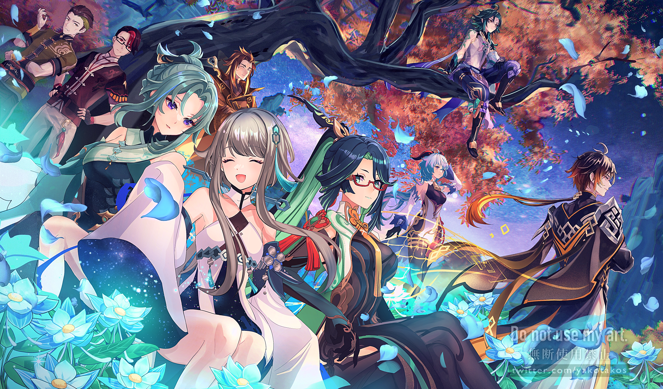 4girls 5boys ahoge aqua_eyes aratakosu_(tako's) bare_shoulders bead_necklace beads bell black_gloves black_hair blue_hair bodystocking breasts brown_hair character_request closed_mouth colored_inner_hair commentary_request detached_sleeves dress earrings facial_mark forehead_mark ganyu_(genshin_impact) genshin_impact glasses gloves goat_horns green_hair grey_hair guizhong_(genshin_impact) hair_between_eyes hair_ornament highres horns jewelry large_breasts long_hair long_sleeves looking_at_viewer madame_ping_(genshin_impact) medium_breasts moon_carver_(genshin_impact) mountain_shaper_(genshin_impact) multicolored_hair multiple_boys multiple_girls necklace on_tree ponytail semi-rimless_eyewear short_hair_with_long_locks sidelocks sleeves_past_fingers sleeves_past_wrists small_breasts smile tassel two-tone_hair very_long_hair white_dress wide_sleeves xianyun_(genshin_impact) xiao_(genshin_impact) yellow_eyes zhongli_(genshin_impact)