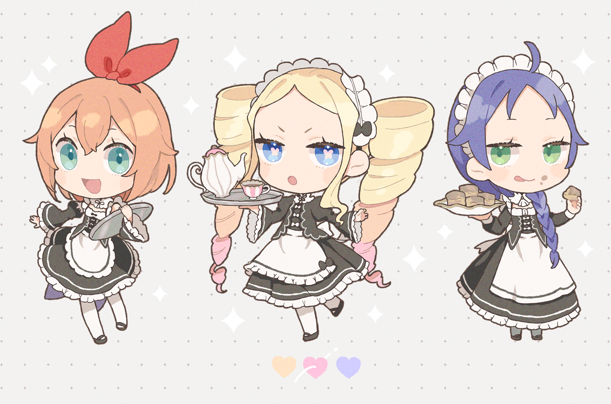 3girls :d :o ahoge alternate_costume beatrice_(re:zero) blonde_hair blue_eyes blush bow_hairband braid butterfly-shaped_pupils chibi commentary_request cup dress drill_hair enmaided eyelashes frills green_eyes hair_between_eyes hairband holding holding_tray long_hair long_sleeves looking_at_viewer maid maid_headdress meili_portroute multiple_girls open_mouth orange_hair pantyhose parupin petra_leyte re:zero_kara_hajimeru_isekai_seikatsu red_ribbon ribbon roswaal_mansion_maid_uniform shoes short_hair sidelocks smile symbol-shaped_pupils teacup teapot tray twin_drills twintails