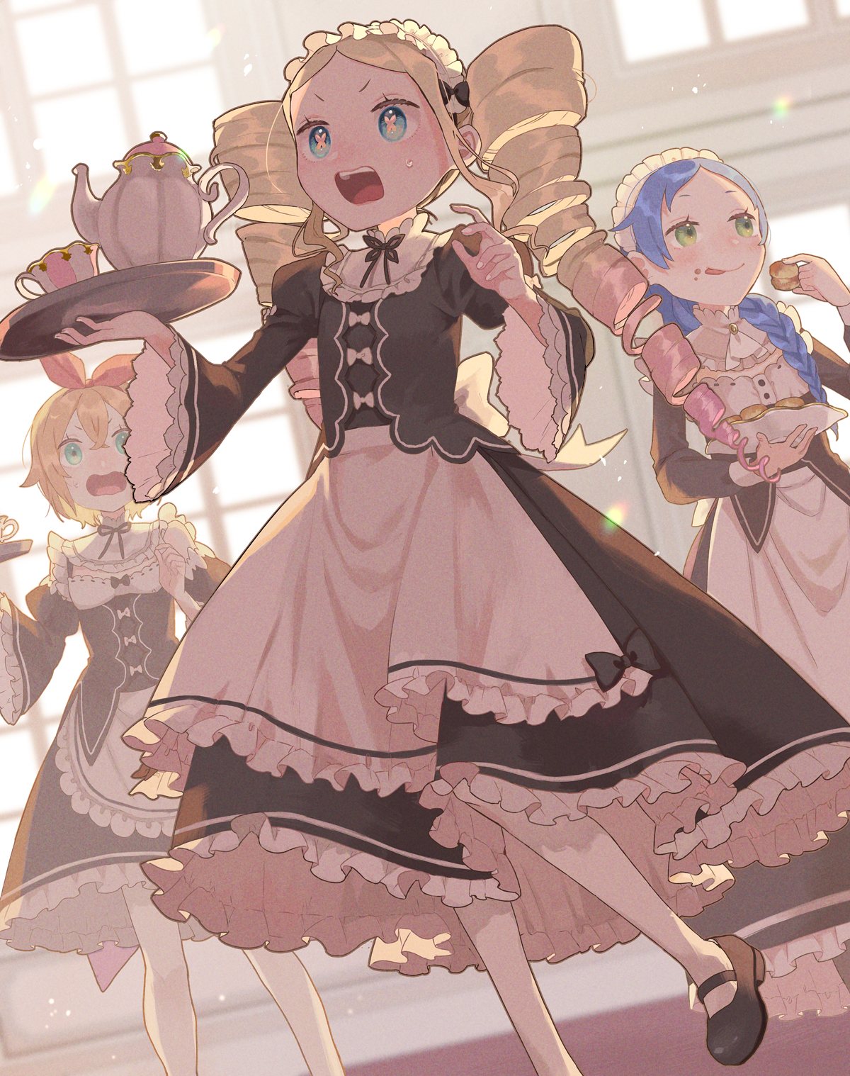 3girls apron beatrice_(re:zero) blonde_hair blue_eyes blue_hair butterfly-shaped_pupils commentary_request cup dress drill_hair eating eyelashes food food_on_face frills from_below green_eyes hair_ribbon highres holding long_hair long_sleeves maid maid_headdress meili_portroute multiple_girls open_mouth orange_hair pantyhose parupin petra_leyte re:zero_kara_hajimeru_isekai_seikatsu red_ribbon ribbon roswaal_mansion_maid_uniform shoes short_hair sweatdrop symbol-shaped_pupils teacup teapot teeth tongue tray twin_drills upper_teeth_only v-shaped_eyebrows waist_apron white_pantyhose