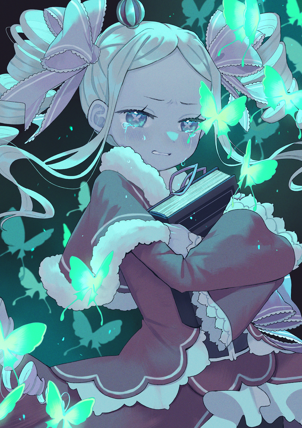 1girl beatrice_(re:zero) blonde_hair blush book bug butterfly butterfly-shaped_pupils capelet commentary crown crying dress drill_hair eyelashes frills fur-trimmed_capelet fur_trim hair_ribbon highres holding holding_book insect long_hair long_sleeves mini_crown parted_lips parupin pink_ribbon re:zero_kara_hajimeru_isekai_seikatsu ribbon short_eyebrows sidelocks solo symbol-shaped_pupils tears twin_drills twintails