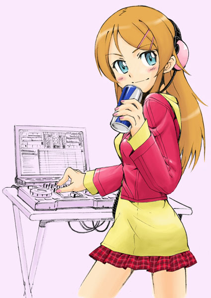 1girl blue_eyes blush brown_hair can closed_mouth computer cowboy_shot dj drink_can feet_out_of_frame female_focus hair_ornament hairclip headphones holding holding_can ichinana_(dametetujin17) kousaka_kirino laptop long_hair long_sleeves looking_at_viewer mixer ore_no_imouto_ga_konna_ni_kawaii_wake_ga_nai plaid_clothes plaid_skirt pleated_skirt product_placement red_bull skirt smile soda_can solo standing