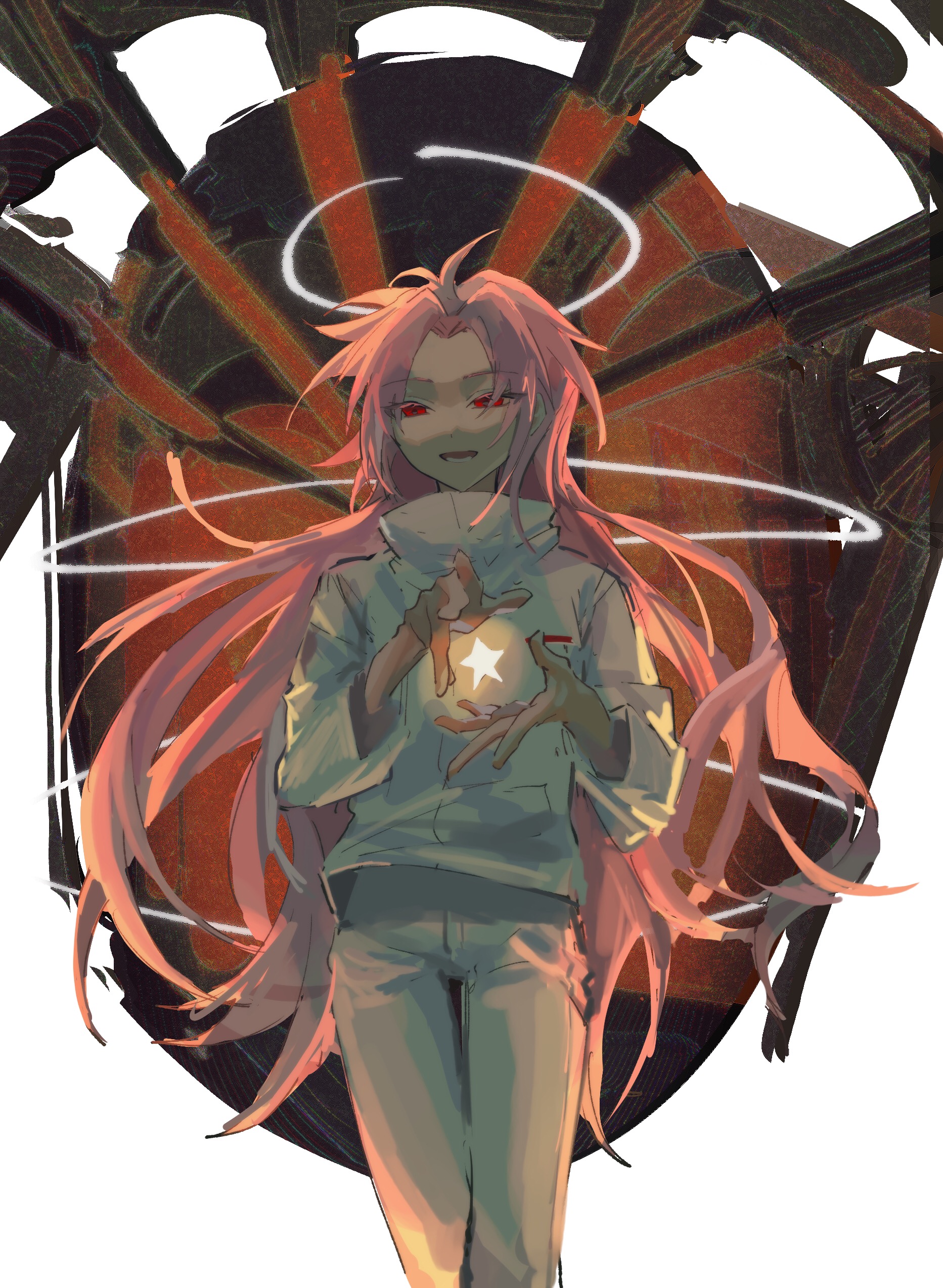 1boy absurdres ahoge chinese_commentary colored_eyelashes commentary_request cowboy_shot curtained_hair edoupaoxiao halo hatsutori_hajime high_collar highres jacket long_hair long_sleeves lower_teeth_only male_focus open_mouth pants parted_bangs pink_hair red_eyes saibou_shinkyoku smile solo star_(symbol) teeth very_long_hair white_jacket white_pants