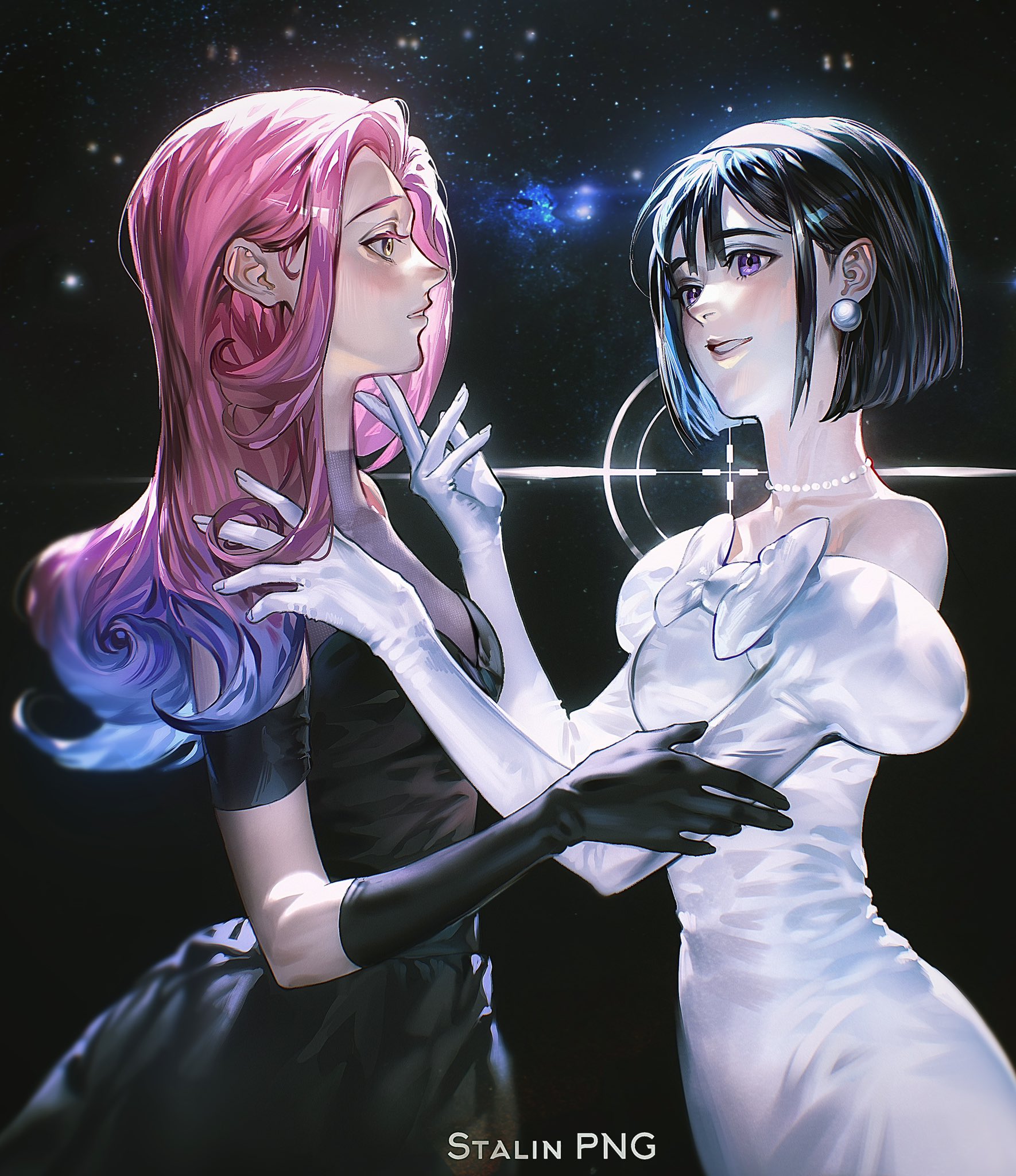 2girls alien_stage bare_shoulders black_dress black_gloves black_hair blue_hair bow chest_bow commentary crosshair dress earrings elbow_gloves english_commentary from_side gloves gradient_hair hairband hand_on_another's_chin highres jewelry juliet_sleeves long_sleeves looking_at_another mizi_(alien_stage) multicolored_hair multiple_girls necklace off-shoulder_dress off_shoulder pearl_earrings pearl_necklace pink_hair puffy_sleeves purple_eyes short_hair smile stalinpng star_(sky) sua_(alien_stage) two-tone_hair white_bow white_dress white_hairband yellow_eyes yuri
