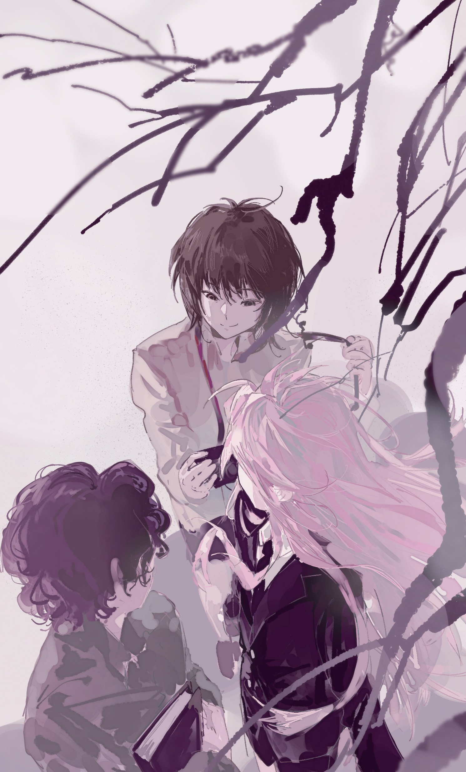 3boys absurdres black_hair black_jacket black_necktie black_shorts book branch brown_eyes brown_hair camera chinese_commentary closed_mouth commentary_request grey_shirt haoyueqianli711 harada_minoru hatsutori_hajime highres holding holding_book holding_camera jacket lapels long_hair long_sleeves male_focus multiple_boys necktie notched_lapels pink_hair saibou_shinkyoku shirt short_hair shorts smile suit_jacket utsugi_noriyuki white_shirt