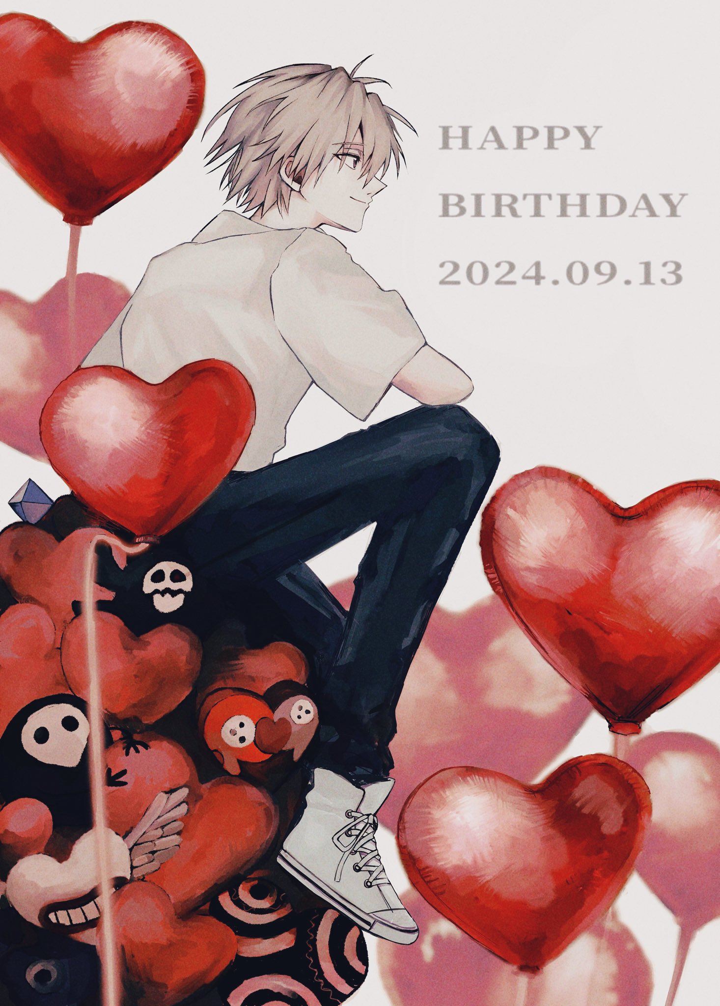 1boy balloon black_pants commentary dated elbow_on_knee english_text grey_hair happy_birthday heart_balloon highres knee_up kozuminon leliel_(evangelion) looking_ahead male_focus nagisa_kaworu neon_genesis_evangelion pants profile sachiel_(evangelion) shirt shoelaces short_sleeves sitting solo white_footwear white_shirt zeruel_(evangelion)