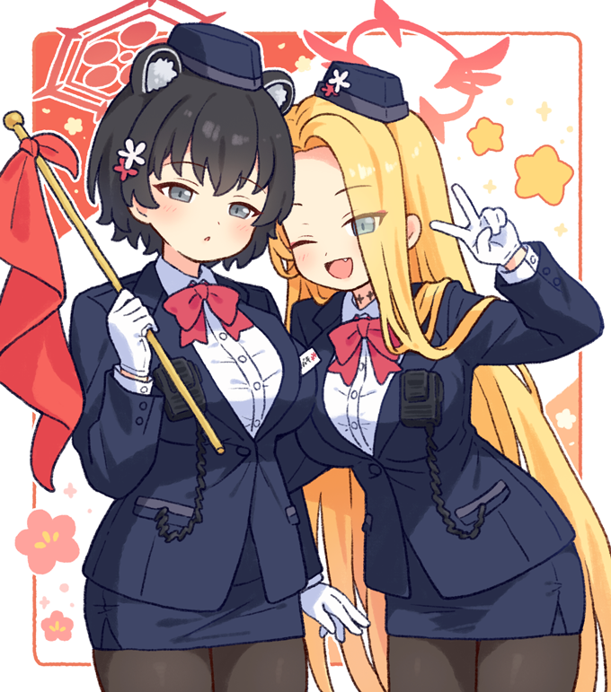 2girls animal_ears black_hair black_pantyhose blonde_hair blue_archive blue_jacket blue_skirt blush bow bowtie breasts collarbone fang flag garrison_cap gloves hair_ornament halo hat holding holding_flag jacket long_hair long_sleeves looking_at_viewer multiple_girls one_eye_closed onyhakase open_mouth pantyhose pencil_skirt pina_(blue_archive) pina_(guide)_(blue_archive) red_bow red_bowtie shirt short_hair simple_background skirt star_(symbol) tsubaki_(blue_archive) tsubaki_(guide)_(blue_archive) v very_long_hair white_gloves white_shirt