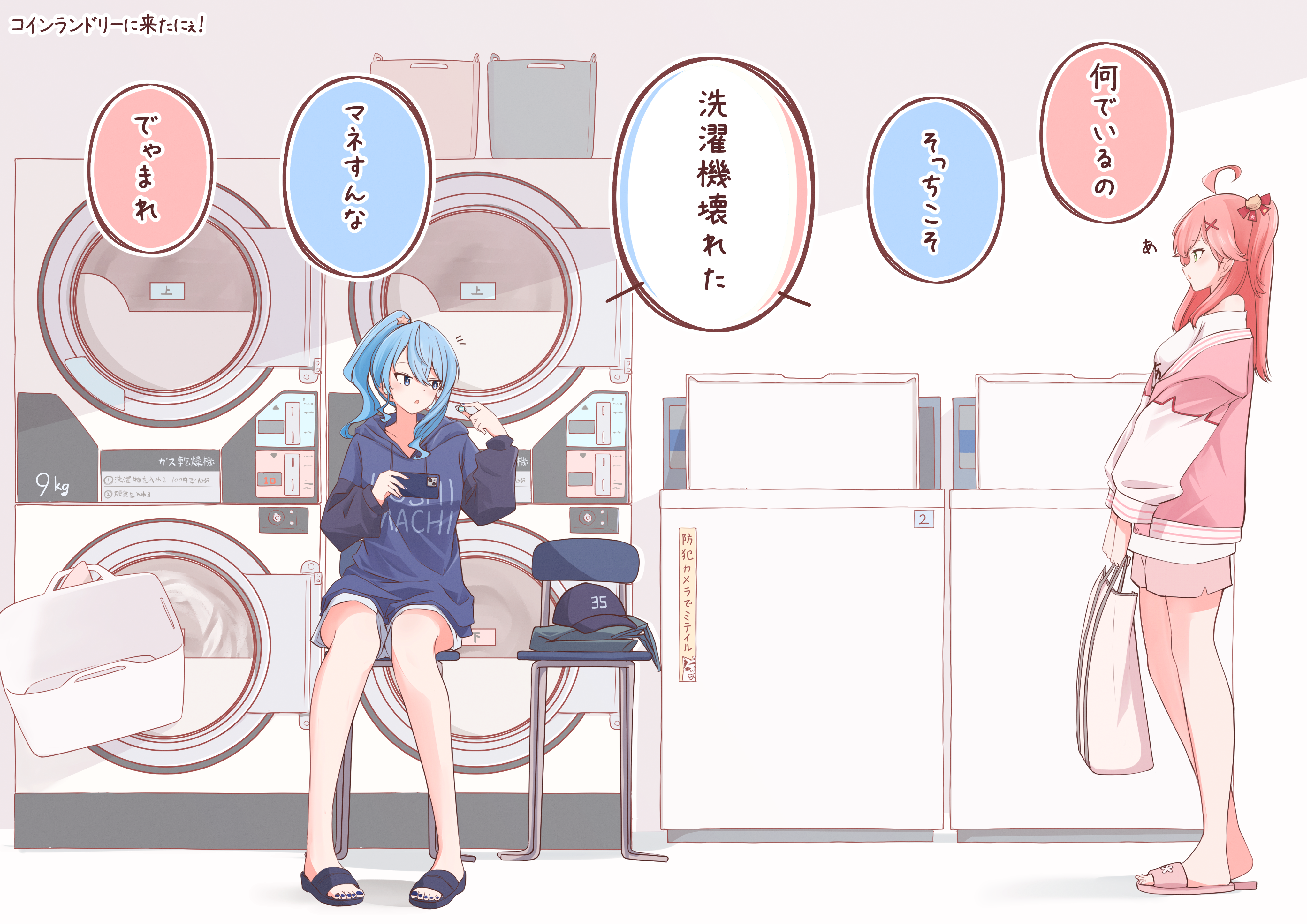 2girls absurdres ahoge alternate_costume baseball_cap blue_eyes blue_hair chamomile_(kazumasa) earphones_removed green_eyes hat highres holding holding_phone hololive hoshimachi_suisei jacket letterman_jacket looking_at_another multiple_girls phone pink_hair pink_jacket ponytail sakura_miko sandals shirt short_shorts shorts slice_of_life speech_bubble unworn_headwear virtual_youtuber washing_machine white_shirt