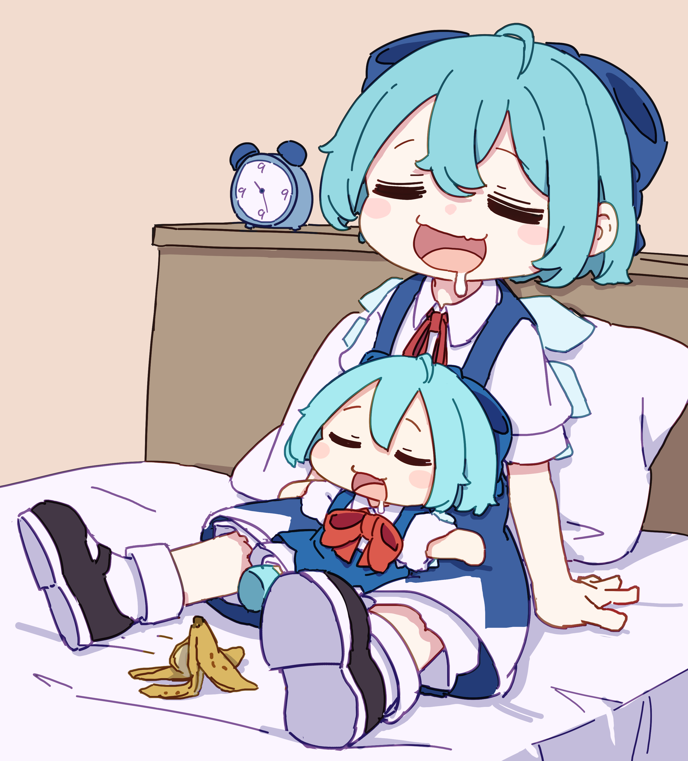 2girls absurdres ahoge alarm_clock banana_peel black_shoes blue_bow blue_dress blue_hair blush_stickers bow cirno clock closed_eyes commentary dress drooling fairy fairy_wings fumo_(doll) hair_bow highres ice ice_wings indoors kame_(kamepan44231) leaning_on_person multiple_girls neck_ribbon on_bed open_mouth pillow pinafore_dress red_bow red_ribbon ribbon shoes short_hair short_sleeves sleeping sleeveless sleeveless_dress socks touhou wings