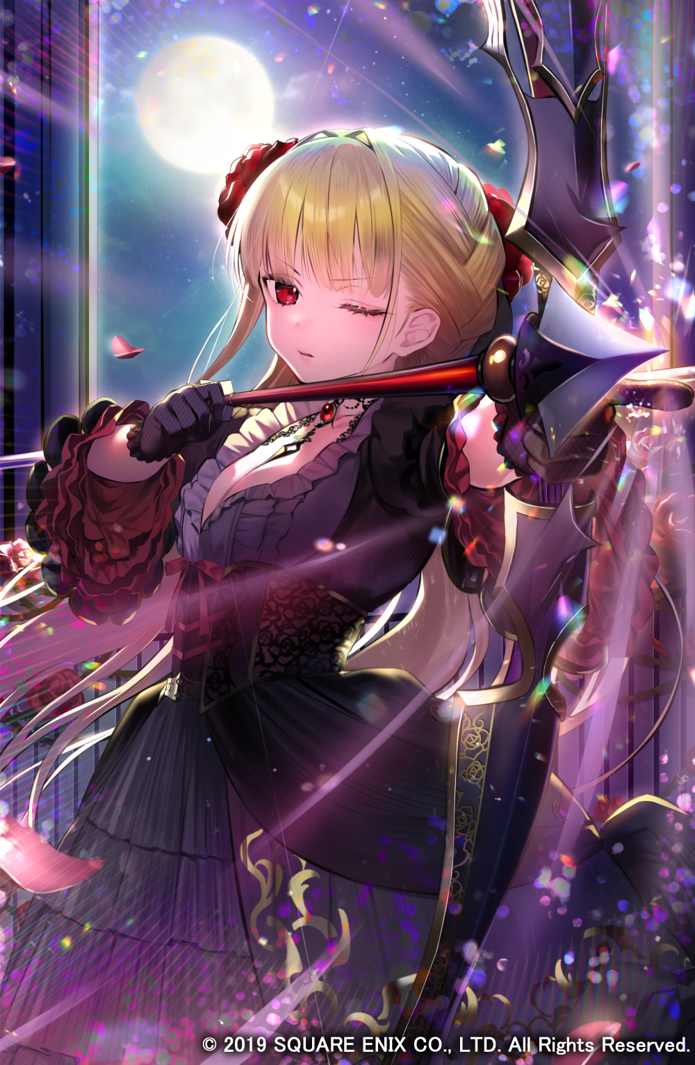 1girl arrow_(projectile) asagi_yuna black_dress black_gloves blonde_hair bow_(weapon) breasts copyright_notice dress flower gloves grimms_echoes hair_flower hair_ornament highres holding holding_arrow holding_bow_(weapon) holding_weapon la_belle_the_beauty_(grimms_echoes) moonlight night official_art one_eye_closed red_eyes red_flower red_rose rose solo weapon
