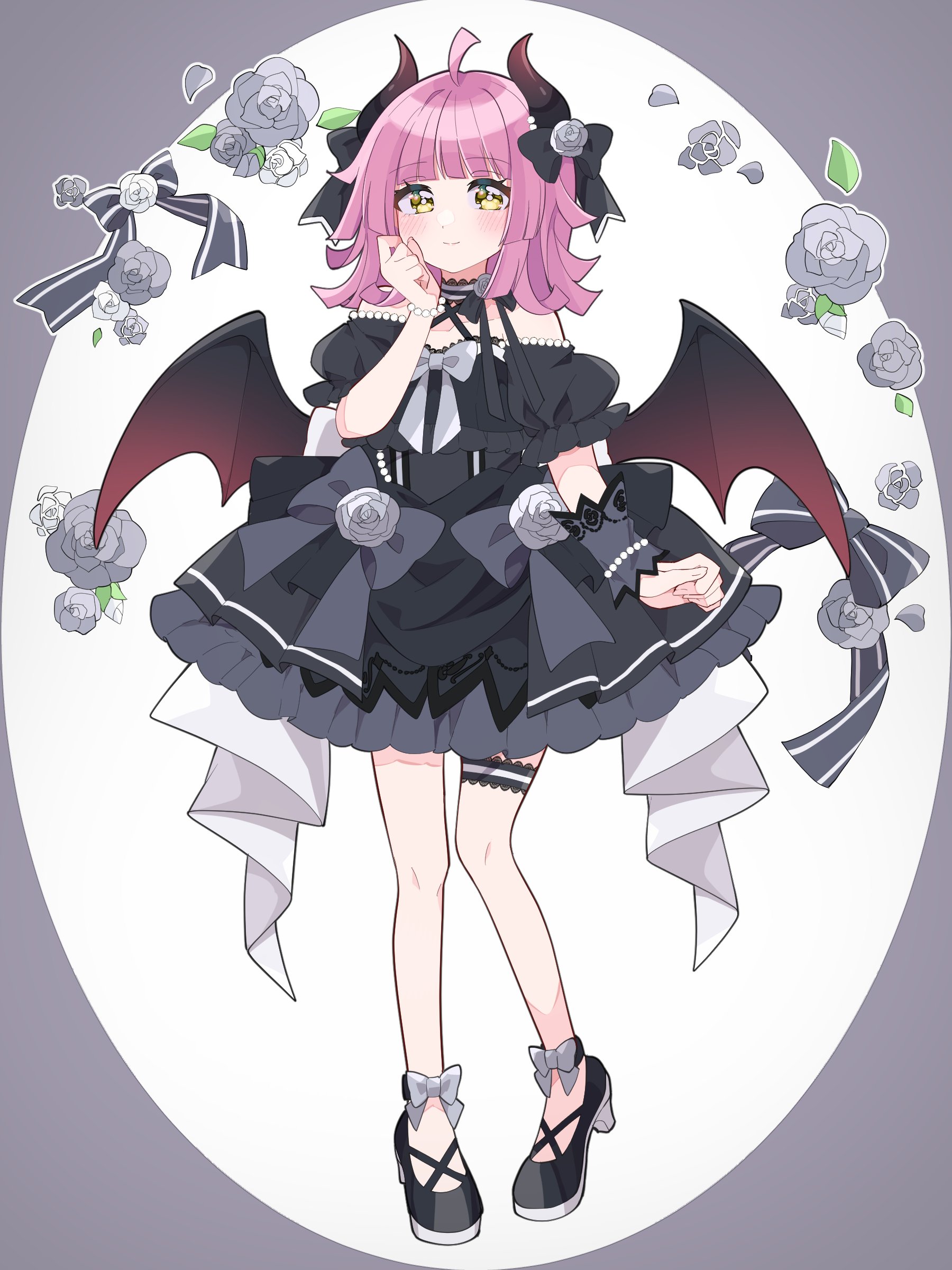 1girl absurdres ahoge alternate_costume bat_wings black_bow black_dress black_horns black_shoes black_wings blunt_bangs blunt_ends blush bow clenched_hand closed_mouth collarbone commentary criss-cross_halter demon_horns demon_wings dress floral_background flower frilled_dress frills full_body grey_bow grey_flower grey_rose hair_bow hair_flower hair_ornament halter_dress halterneck hand_up highres horns kam_tuki kishimen_hair looking_at_viewer love_live! love_live!_nijigasaki_high_school_idol_club medium_hair off-shoulder_dress off_shoulder oval_border pink_hair puffy_short_sleeves puffy_sleeves rose round_border shoes short_dress short_sleeves smile solo split_mouth tennoji_rina white_background wings yellow_eyes