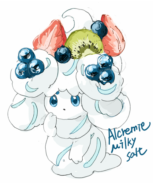 1girl :o alcremie alcremie_(berry_sweet) alcremie_(salted_cream) blue_eyes blueberry cc8nw42u15apug0 character_name colored_skin food fruit full_body gen_8_pokemon hair_ornament kiwi_(fruit) long_hair looking_at_viewer nintendo open_mouth pokemon pokemon_(creature) simple_background solo strawberry white_background white_hair white_skin