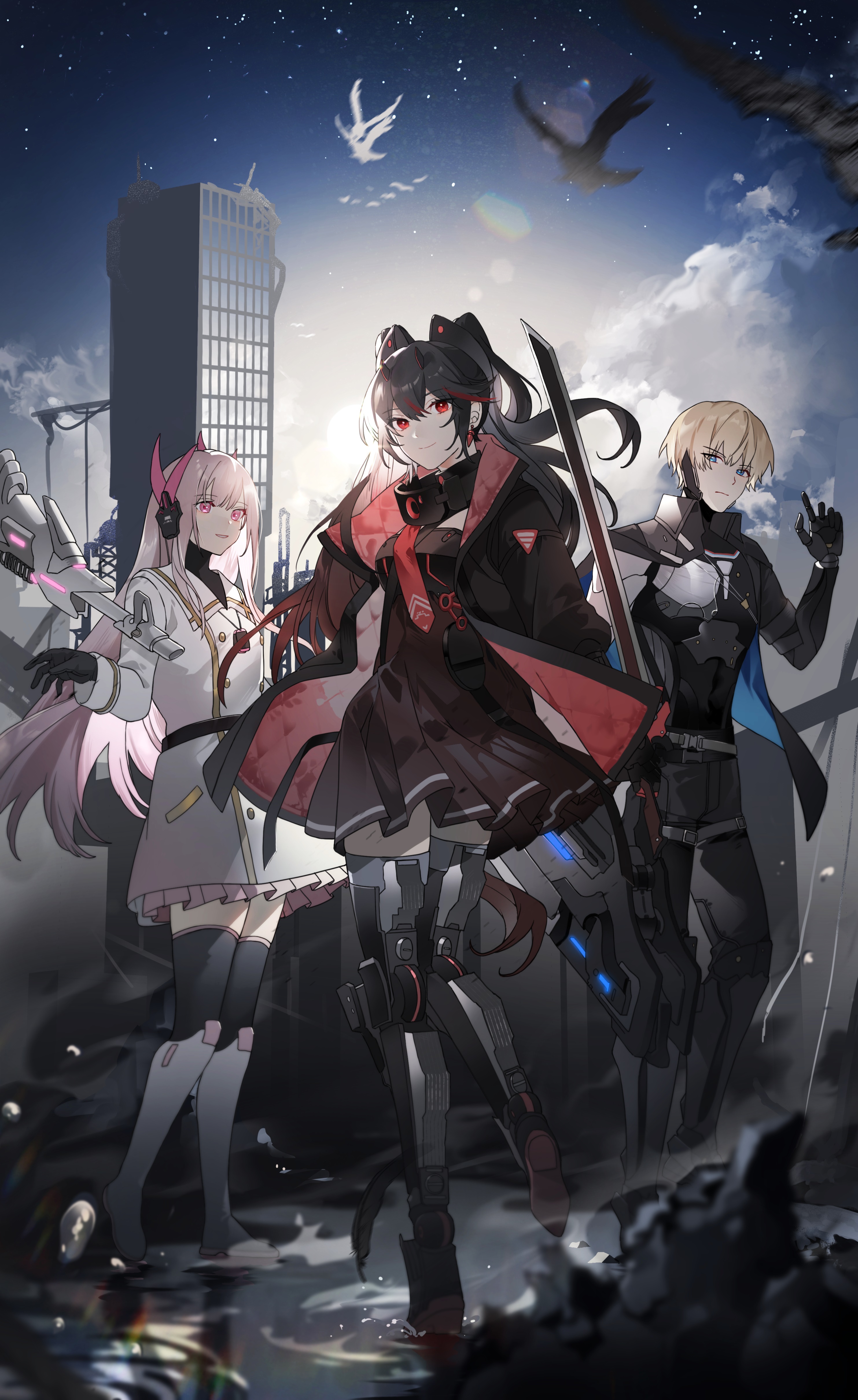 1boy 2girls absurdres black_bodysuit black_dress black_gloves black_hair black_jacket blonde_hair blue_eyes bodysuit cino_(cappuccino) dress floating floating_object floating_weapon gloves gown gradient_hair grey_dress grey_hair headgear headphones highres holding holding_sword holding_weapon jacket joints lee:_hyperreal_(pgr) lee_(pgr) liv:_eclipse_(pgr) liv_(pgr) long_hair long_sleeves lucia:_plume_(pgr) lucia_(pgr) mechabare mechanical_legs multicolored_hair multiple_girls necktie pink_eyes punishing:_gray_raven red_hair red_jacket red_necktie robot_joints short_hair streaked_hair sword twintails two-sided_fabric two-sided_jacket very_long_hair weapon
