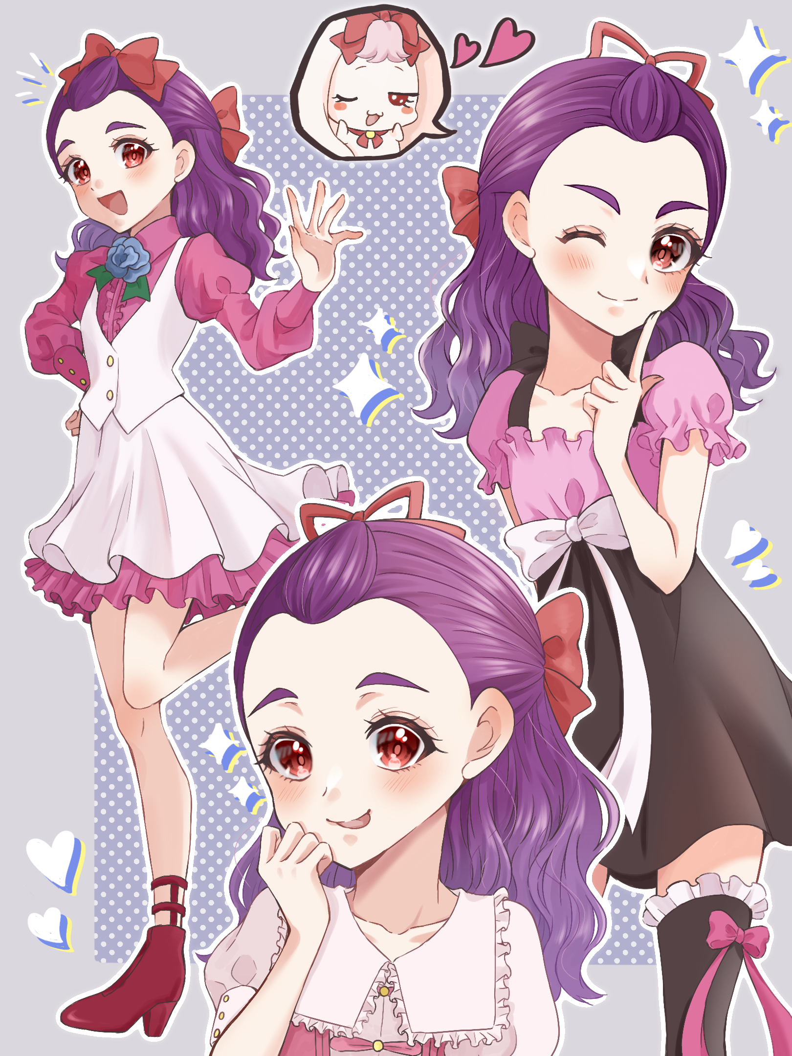 1girl ;) black_thighhighs blue_flower blue_rose bow collarbone dress flower full_body hair_bow hair_ribbon half_updo heart high_heels highres long_hair long_sleeves milk_(precure) mimino_kurumi multiple_views one_eye_closed open_mouth pink_dress precure purple_hair red_eyes red_ribbon ribbon rose shigen_pr short_sleeves smile standing thighhighs wavy_hair yellow_bow yes!_precure_5 yes!_precure_5_gogo!