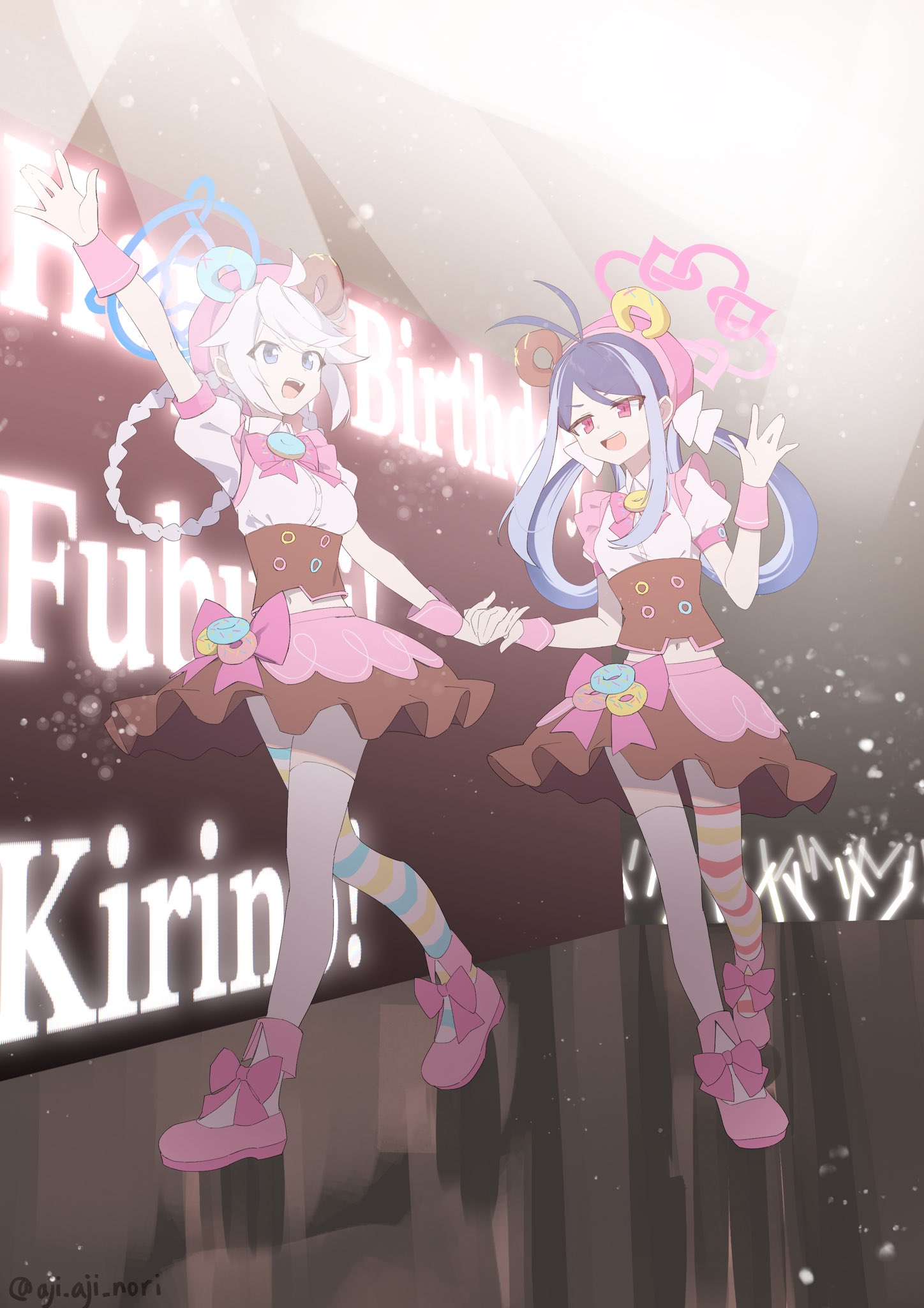 2girls aji_aji_nori alternate_costume alternate_hairstyle antenna_hair blue_archive blue_eyes blue_hair blue_halo boots bow bowtie braid breasts commentary english_commentary food-themed_clothes food-themed_hat fubuki_(blue_archive) fubuki_(idol)_(blue_archive) full_body glowstick halo happy_birthday hat highres holding_hands idol idol_clothes kirino_(blue_archive) kirino_(idol)_(blue_archive) long_braid long_hair midriff multicolored_hair multicolored_thighhighs multiple_girls navel official_alternate_costume open_mouth pink_boots pink_eyes pink_halo puffy_short_sleeves puffy_sleeves shoes short_sleeves skirt thighhighs twintails twitter_username white_hair