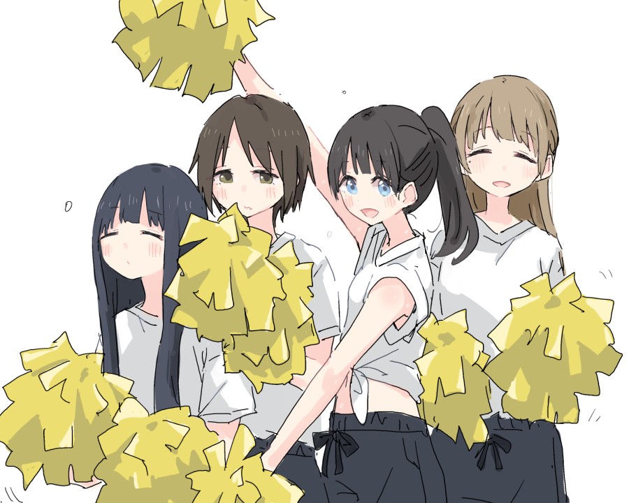 4girls akebi-chan_no_serafuku akebi_komichi black_hair blonde_hair blue_eyes blue_shorts brown_eyes brown_hair closed_eyes excited gym_uniform kamimoku_neko long_hair multiple_girls nawashiro_yasuko pom_pom_(clothes) ponytail shiroshi_(denpa_eshidan) shirt short_hair shorts sleepy t-shirt tanigawa_kei upper_body white_background white_shirt