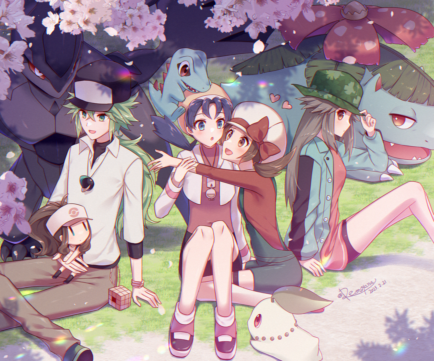 1boy 3girls :d :o adjusting_clothes adjusting_headwear aqua_jacket arm_support bike_shorts black_hat blue_eyes blue_hair blue_overalls blush bow bracelet brown_eyes brown_hair brown_pants buttons camouflage character_doll cherry_blossoms chikorita commentary_request cropped_jacket doll falling_petals gen_1_pokemon gen_2_pokemon gen_5_pokemon green_eyes green_hair green_hat happy hat hat_bow hat_ribbon heart highres hilda_(pokemon) jacket jewelry kris_(pokemon) leaf_(pokemon) leaf_(sygna_suit)_(pokemon) legendary_pokemon long_hair long_sleeves lyra_(pokemon) multiple_girls n_(pokemon) nintendo official_alternate_costume on_head open_clothes open_jacket open_mouth outdoors overalls pants petals plant pokegear pokemon pokemon_(creature) pokemon_black_and_white pokemon_gold/silver/crystal pokemon_heartgold_and_soulsilver pokemon_masters_ex pokemon_on_head red_bow red_ribbon red_shirt remoyona ribbon shirt shoes shorts sitting smile totodile twintails venusaur white_hat white_jacket white_shirt yellow_hat zekrom