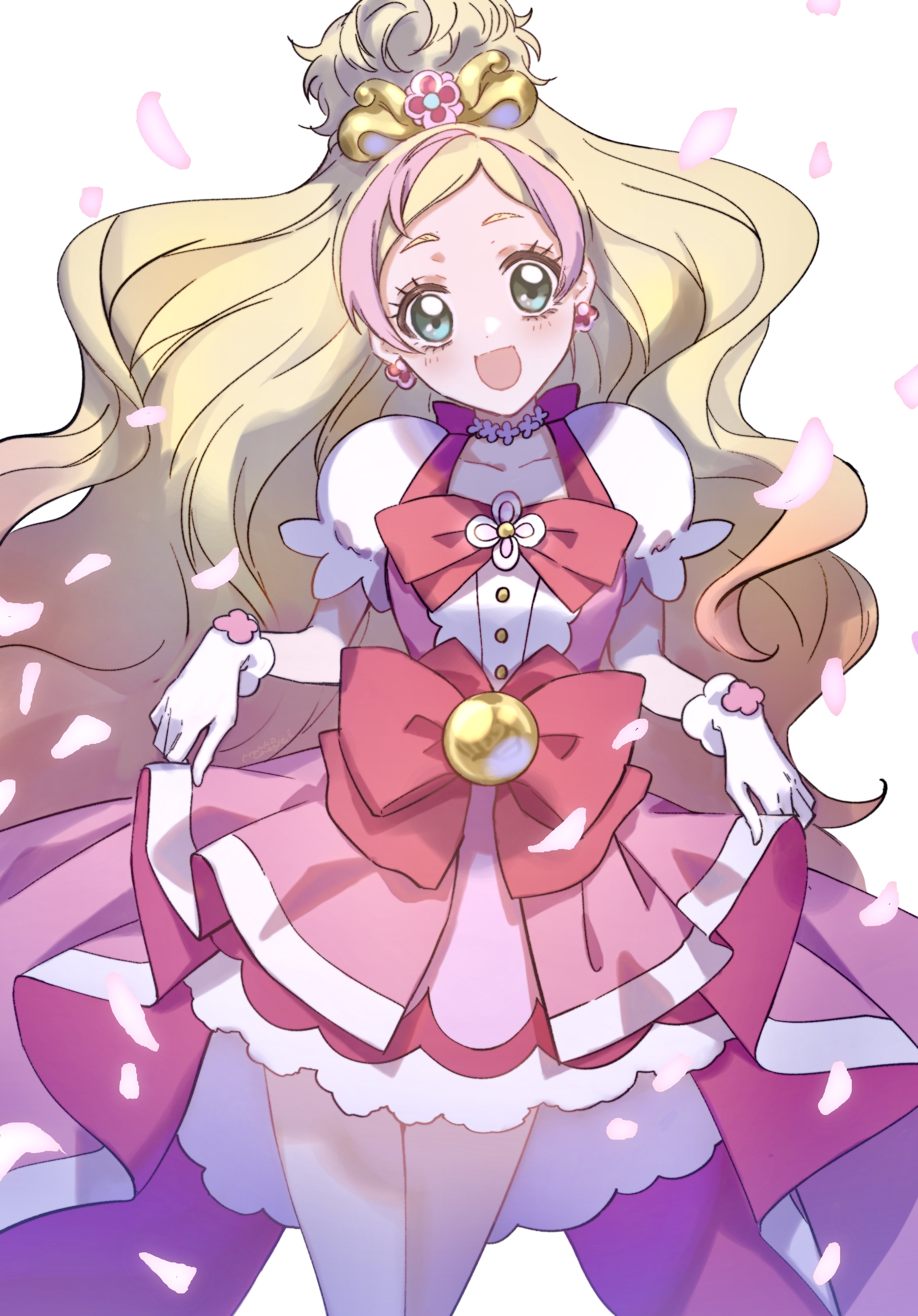 1girl :d absurdres blonde_hair bow brooch choker clothes_lift commentary cowboy_shot cure_flora curtsey earrings falling_petals flower flower_brooch flower_earrings flower_necklace frilled_skirt frills gloves go!_princess_precure green_eyes haruno_haruka highres holding_own_skirt jewelry long_hair looking_at_viewer magical_girl multicolored_hair necklace open_mouth petals pink_bow pink_hair pink_skirt precure puffy_sleeves simple_background skirt skirt_lift smile solo standing streaked_hair two-tone_hair waist_bow waist_brooch white_background white_gloves yin_yang6