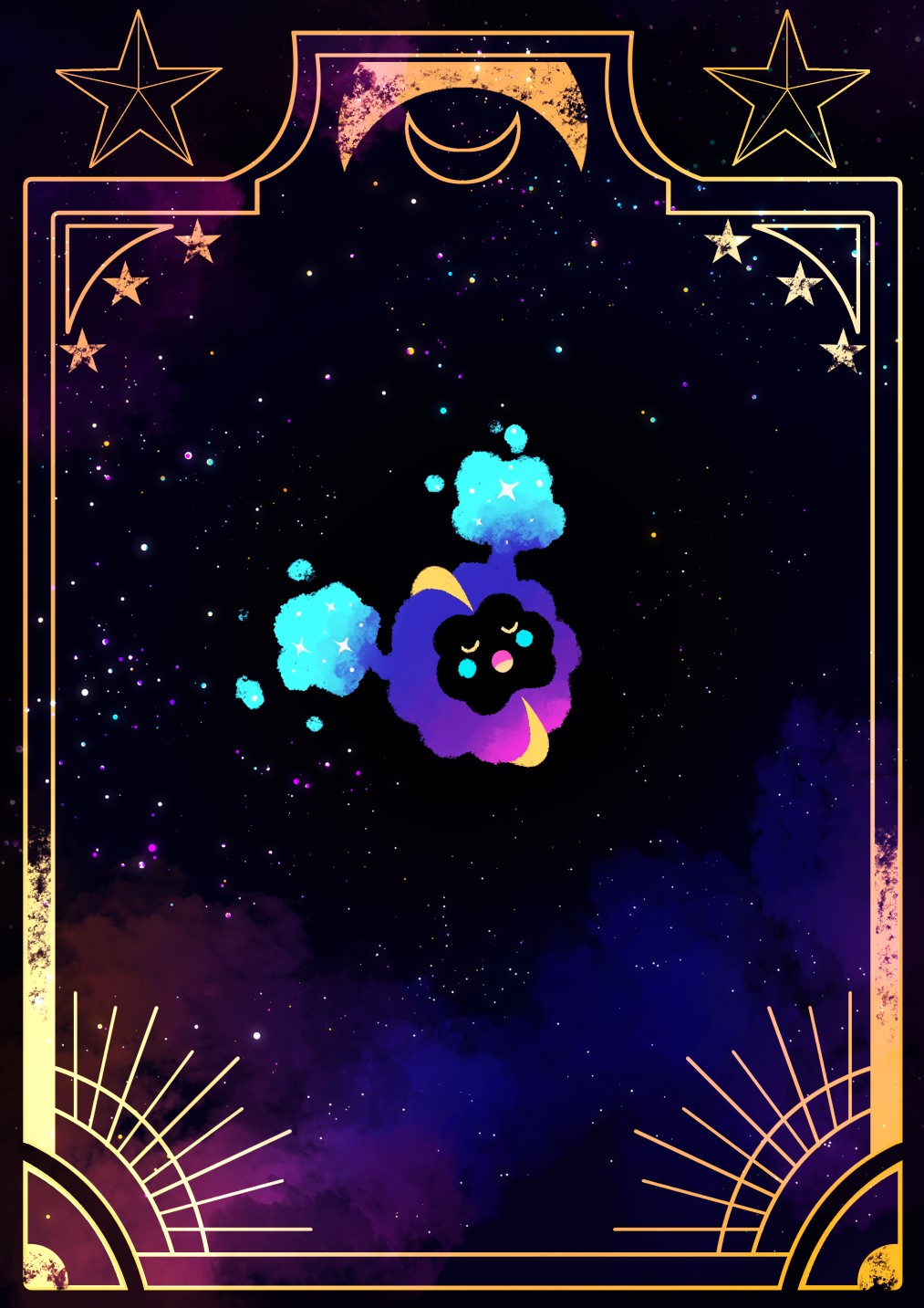 :o animal_focus blush_stickers border closed_eyes cosmog crescent full_body gen_7_pokemon highres i-nn legendary_pokemon nintendo no_humans open_mouth outdoors pokemon pokemon_(creature) solo space star_(sky) star_(symbol) u_u yellow_border