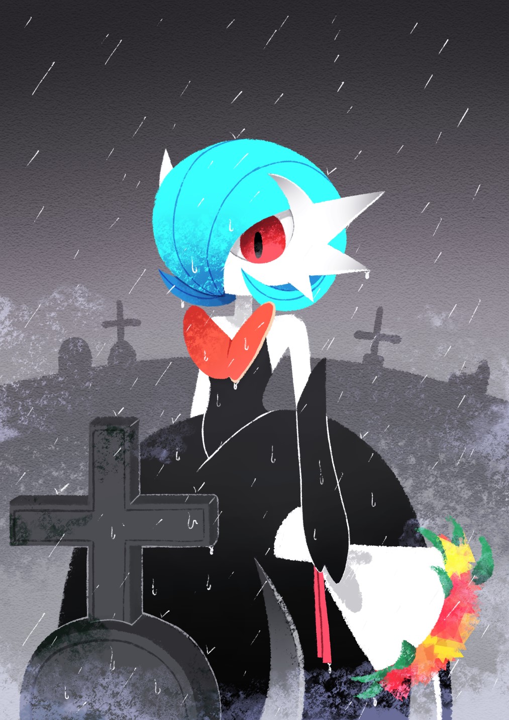1girl alternate_color arms_at_sides bare_shoulders black_dress black_gloves blue_hair bob_cut bouquet colored_skin cross dress elbow_gloves female_focus flat_chest flower gardevoir gen_3_pokemon gloves gradient_sky graveyard grey_background grey_sky hair_over_one_eye highres holding holding_bouquet i-nn long_dress looking_down mega_gardevoir mega_pokemon nintendo no_mouth one_eye_covered outdoors pokemon pokemon_(creature) rain red_eyes shiny_pokemon short_hair sky solo strapless strapless_dress tombstone wet white_skin