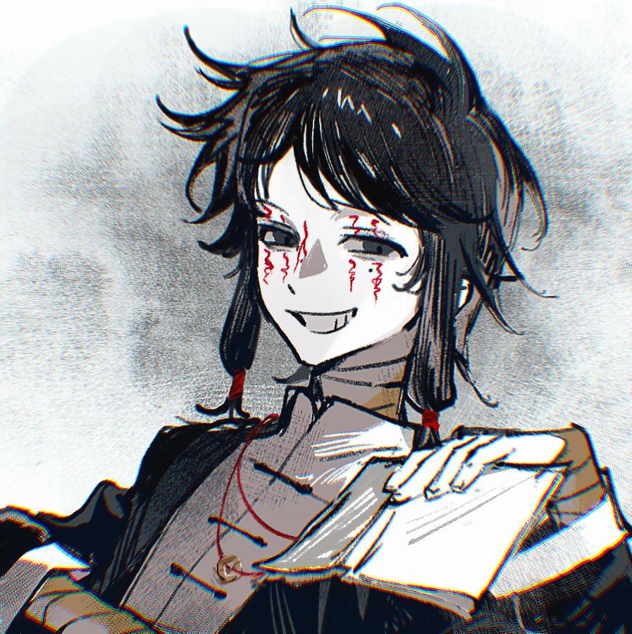 1boy bandaged_arm bandaged_neck bandages black_eyes black_hair black_jacket book chinese_commentary chromatic_aberration colored_skin commentary_request facepaint grin holding holding_book ininenine jacket long_sleeves male_focus mole mole_under_eye open_clothes open_jacket shirt short_hair smile solo swept_bangs touqi_guaitan upper_body white_shirt white_skin ziche_fuzhao