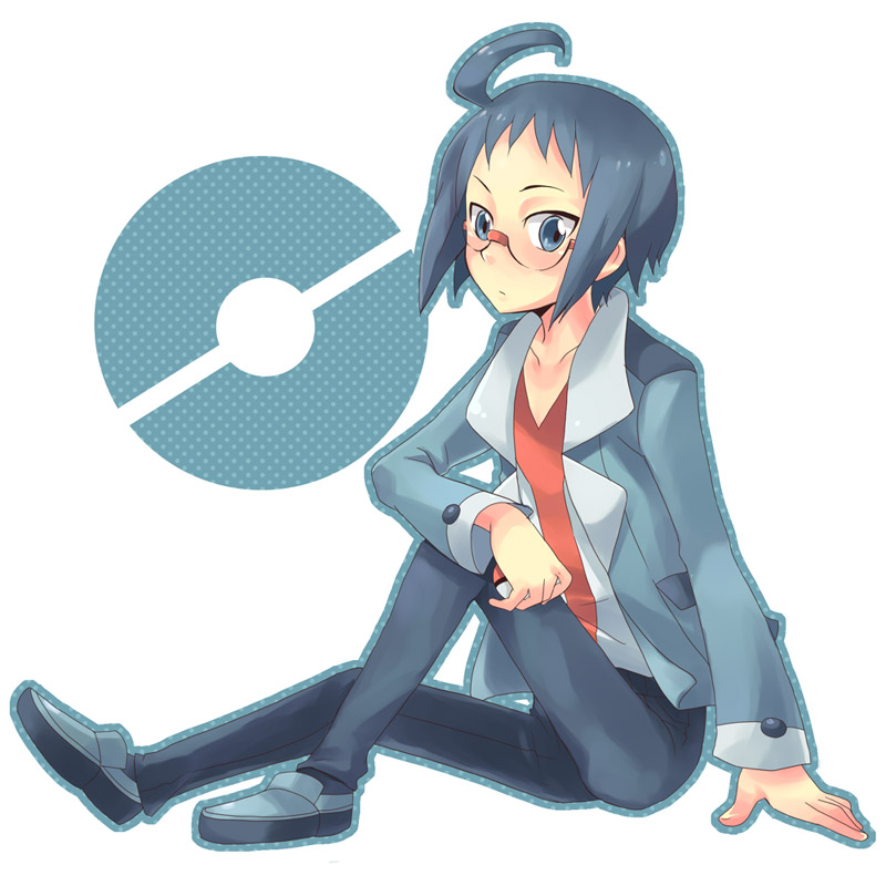 1boy blue_eyes blue_hair cheren_(pokemon) cubexcube glasses jacket male_focus nintendo poke_ball poke_ball_(basic) pokemon pokemon_bw shoes simple_background sitting solo white_background