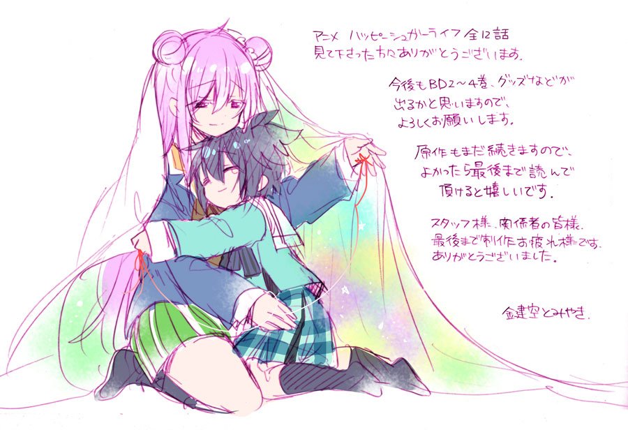 2girls aqua_shirt aqua_skirt black_hair black_socks blue_jacket closed_eyes closed_mouth colored_eyelashes commentary_request double_bun green_skirt hair_bun happy_sugar_life hug jacket kagisora_tomiyaki kneeling koube_shio long_hair matsuzaka_satou multiple_girls official_art pink_eyes pink_hair plaid_clothes plaid_skirt school_uniform serafuku shirt sitting sketch skirt smile socks string string_of_fate striped_clothes striped_skirt tearing_up translation_request twitter_username veil vertical-striped_clothes vertical-striped_skirt very_long_hair