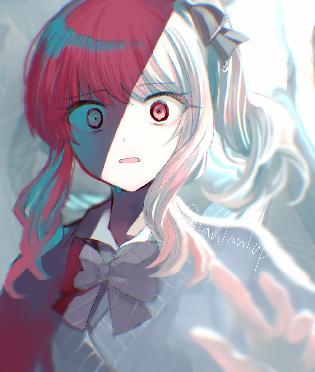 1other akiyama_mizuki blurry blurry_foreground bow bowtie cardigan commentary_request grey_background hand_up highres lanlanlap limited_palette looking_at_viewer medium_hair open_mouth pink_eyes pink_hair project_sekai scared shaded_face side_ponytail sidelocks twitter_username wavy_hair