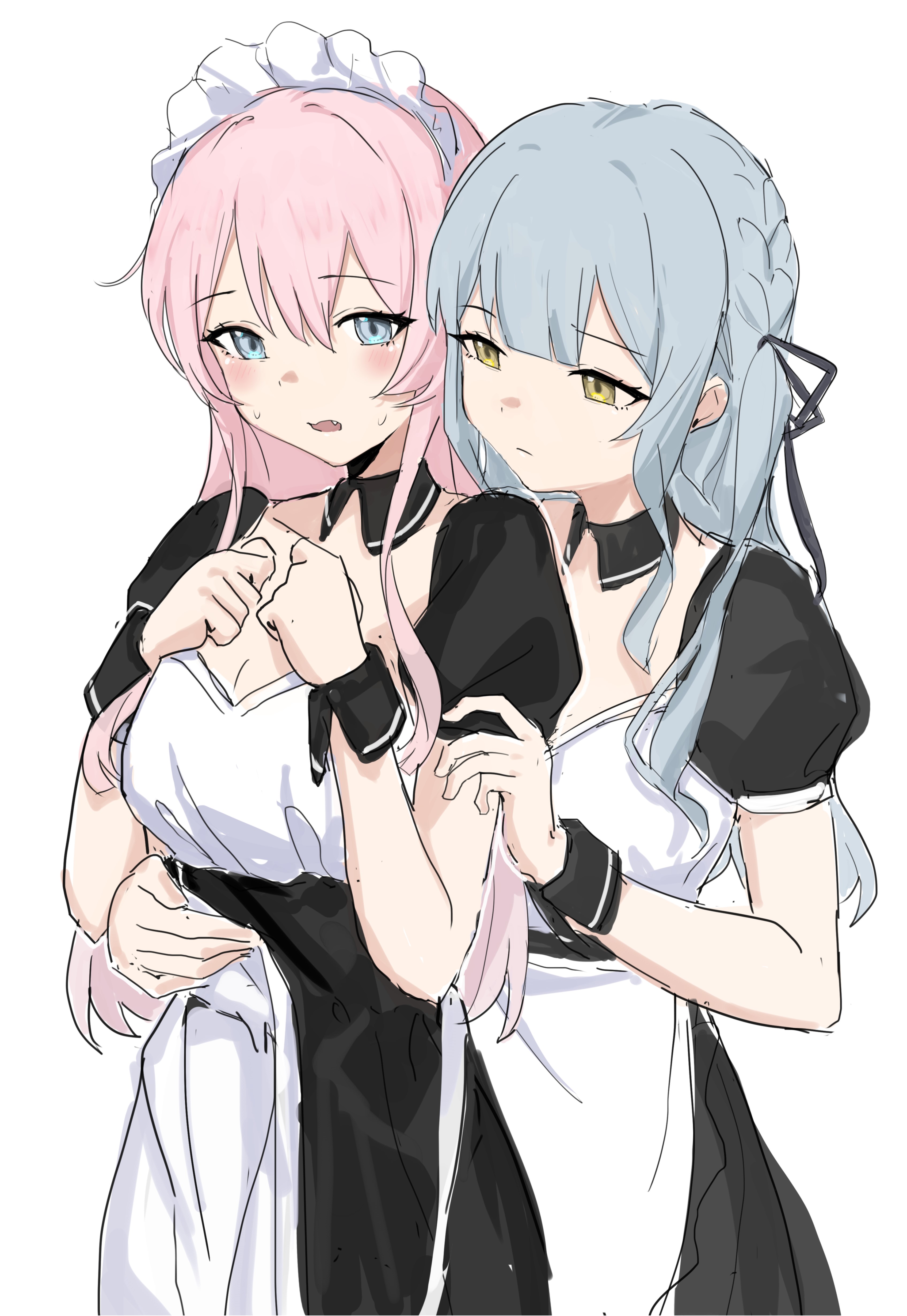 2girls absurdres bang_dream! bang_dream!_it's_mygo!!!!! black_dress black_ribbon black_wrist_cuffs blue_hair blush braid breasts chihaya_anon cleavage commentary cowboy_shot detached_collar dress fang fish_dumplings grey_eyes hair_between_eyes hair_ribbon hand_on_another's_stomach highres long_hair maid maid_headdress multiple_girls nervous open_mouth pink_hair puffy_short_sleeves puffy_sleeves ribbon short_sleeves simple_background togawa_sakiko white_background wrist_cuffs yellow_eyes yuri