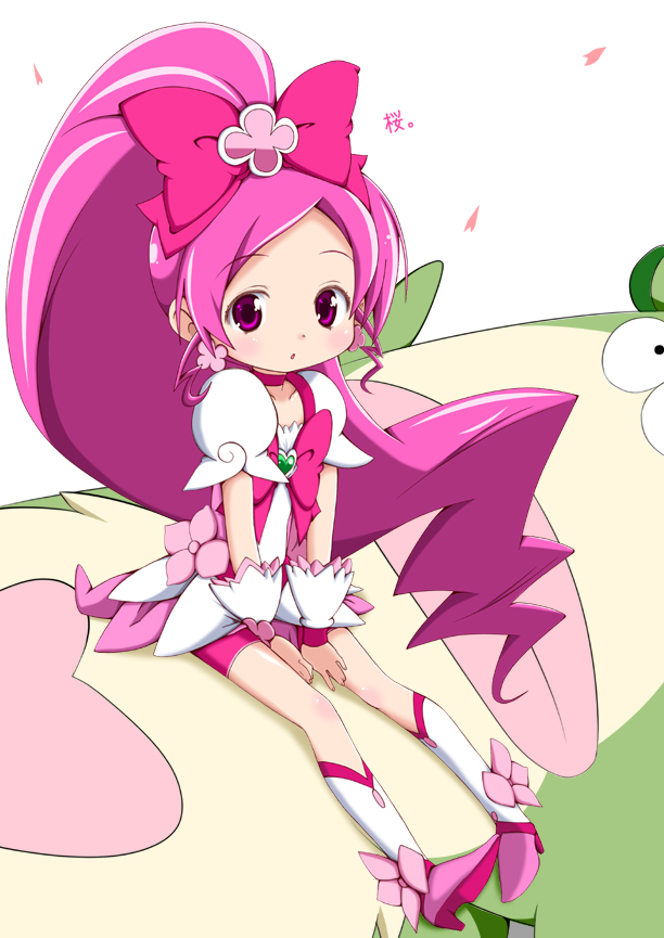 10s 1girl :o bike_shorts boots bow brooch choker coupe_(precure) creature cure_blossom dress earrings flower full_body hair_flower hair_ornament hair_ribbon hanasaki_tsubomi heart heart_brooch heartcatch_precure! high_ponytail jewelry knee_boots long_hair magical_girl matsubara_ryuu pink_bow pink_eyes pink_hair ponytail precure purple_eyes ribbon shorts shorts_under_skirt simple_background sitting wrist_cuffs
