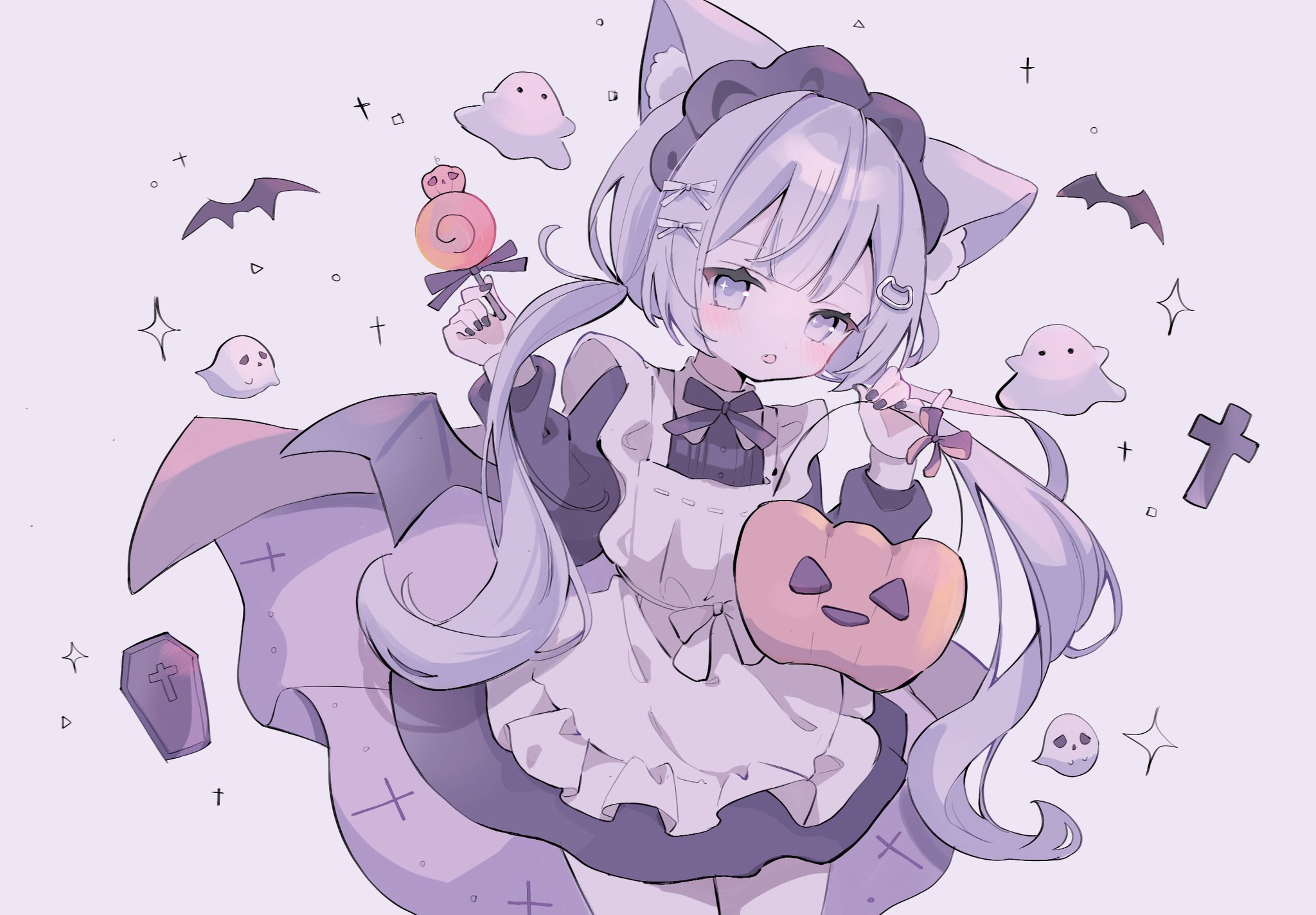 1girl animal_ear_fluff animal_ears animal_print apron bat_print bat_wings black_dress black_nails bow candy cape cat_ears cat_hair_ornament character_request coffin_print commentary_request copyright_request cowboy_shot cross cross_print dress fang food frilled_apron frills ghost hair_bow hair_ornament halloween halloween_bucket halloween_costume highres holding holding_candy holding_food holding_lollipop iro_iro_iroo lollipop long_hair looking_at_viewer maid maid_headdress open_mouth simple_background solo sparkle twintails very_long_hair white_apron white_background white_bow white_eyes white_hair wings
