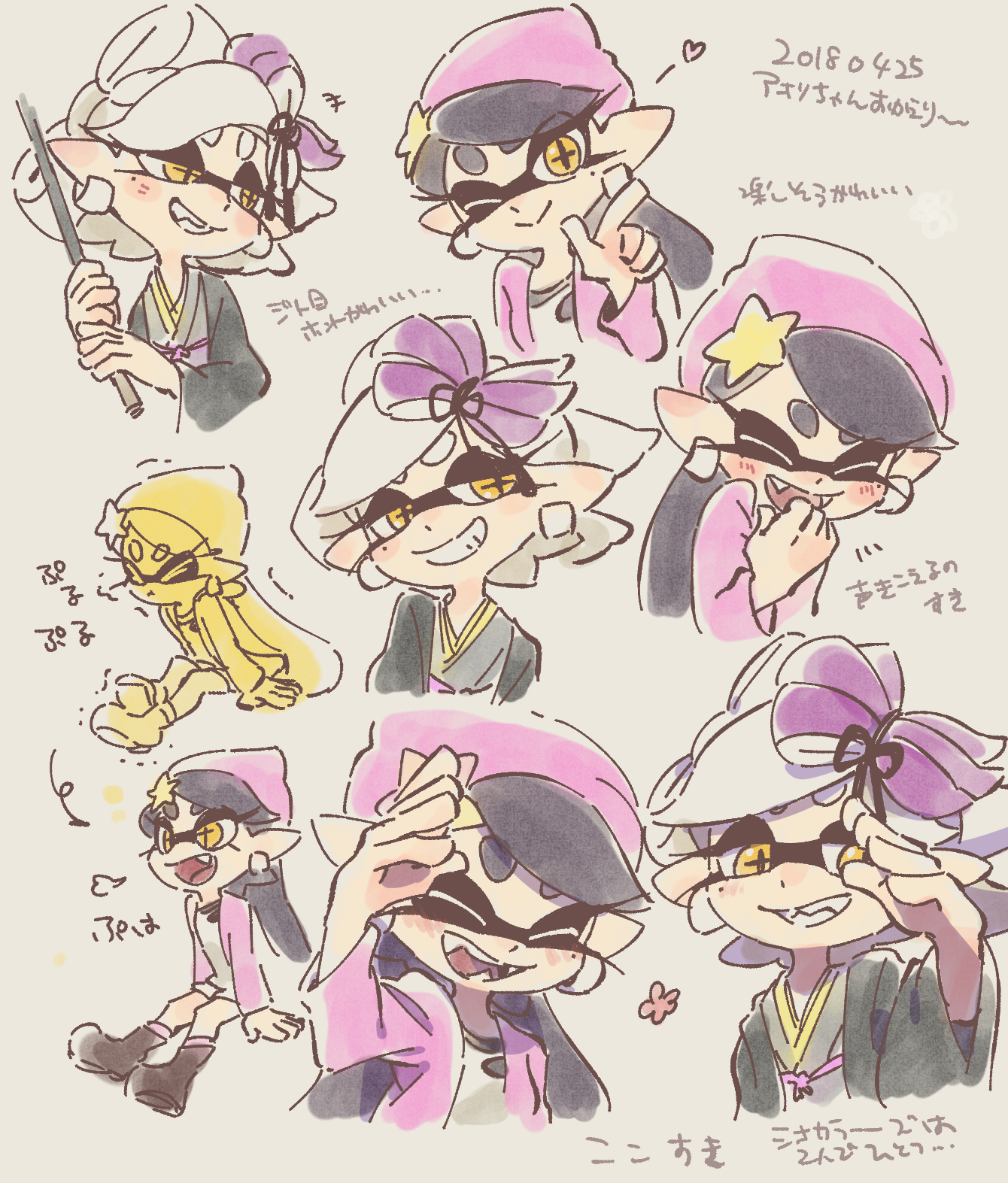 2018 2girls ^_^ arm_up beanie black_hair black_haori blush bow-shaped_hair callie_(agent_1_casual)_(splatoon) callie_(splatoon) cardigan closed_eyes closed_mouth commentary_request cousins cross-shaped_pupils dated earrings fangs grey_hair grey_kimono grin hair_ornament haori hat heart highres holding holding_umbrella inkling japanese_clothes jewelry kimono long_hair long_sleeves marie_(kimono)_(splatoon) marie_(splatoon) mole mole_under_eye multiple_girls multiple_views nintendo open_cardigan open_clothes pink_cardigan pink_hat pointy_ears shirt short_hair smile splatoon_(series) splatoon_2 star_(symbol) star_hair_ornament swept_bangs symbol-shaped_pupils tentacle_hair thick_eyebrows translation_request twintails ukata umbrella white_shirt wide_sleeves yellow_eyes