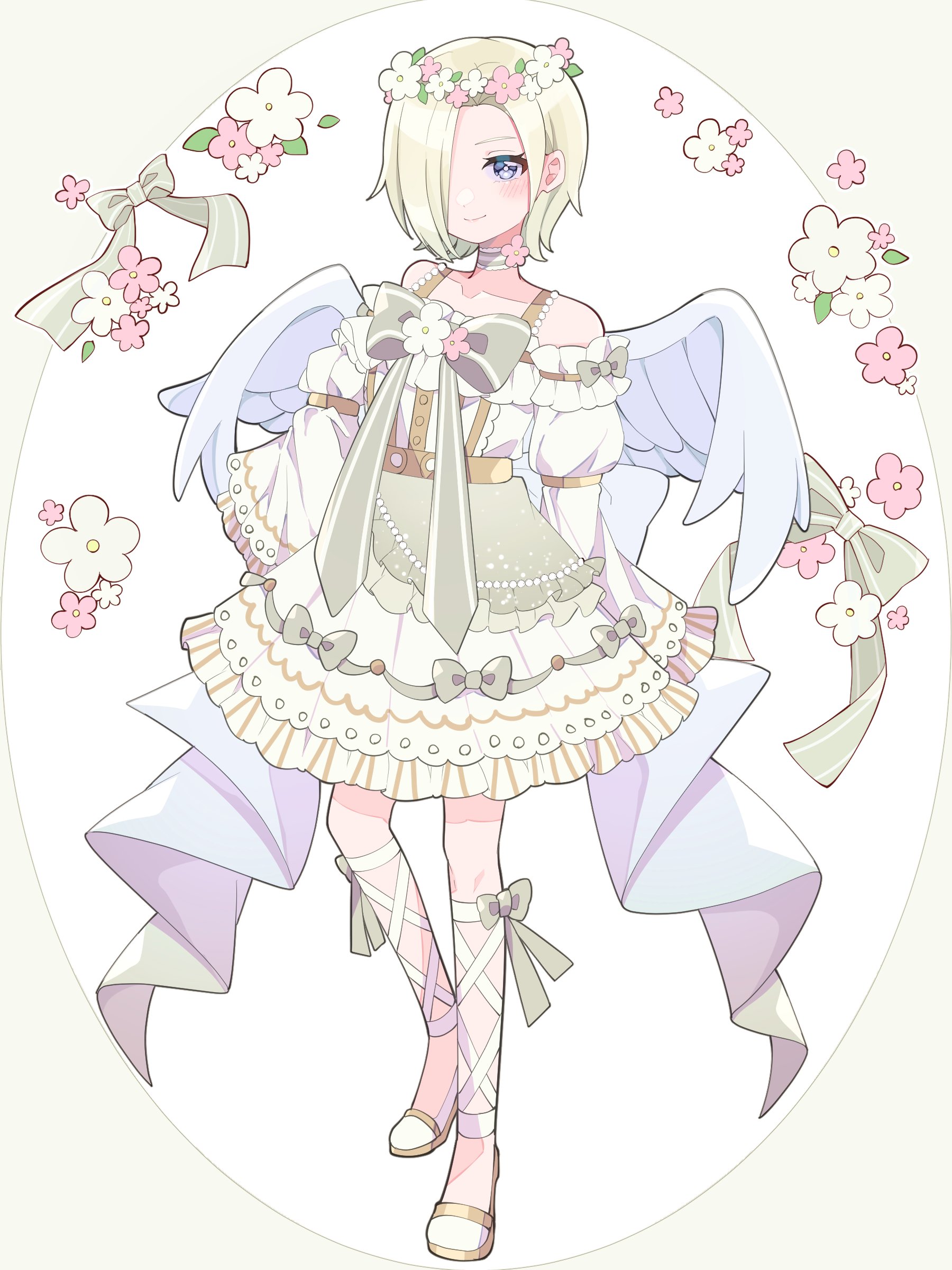 1girl absurdres alternate_costume angel_wings blonde_hair blush border bow collarbone dress dress_bow flower flower_symbol frilled_dress frills full_body grey_border grey_eyes hair_over_one_eye head_wreath highres kam_tuki long_sleeves looking_at_viewer love_live! love_live!_nijigasaki_high_school_idol_club mia_taylor off-shoulder_dress off_shoulder one_eye_covered oval_border pink_flower puffy_long_sleeves puffy_sleeves round_border shoes short_hair smile solo standing white_background white_dress white_flower white_shoes white_wings wings