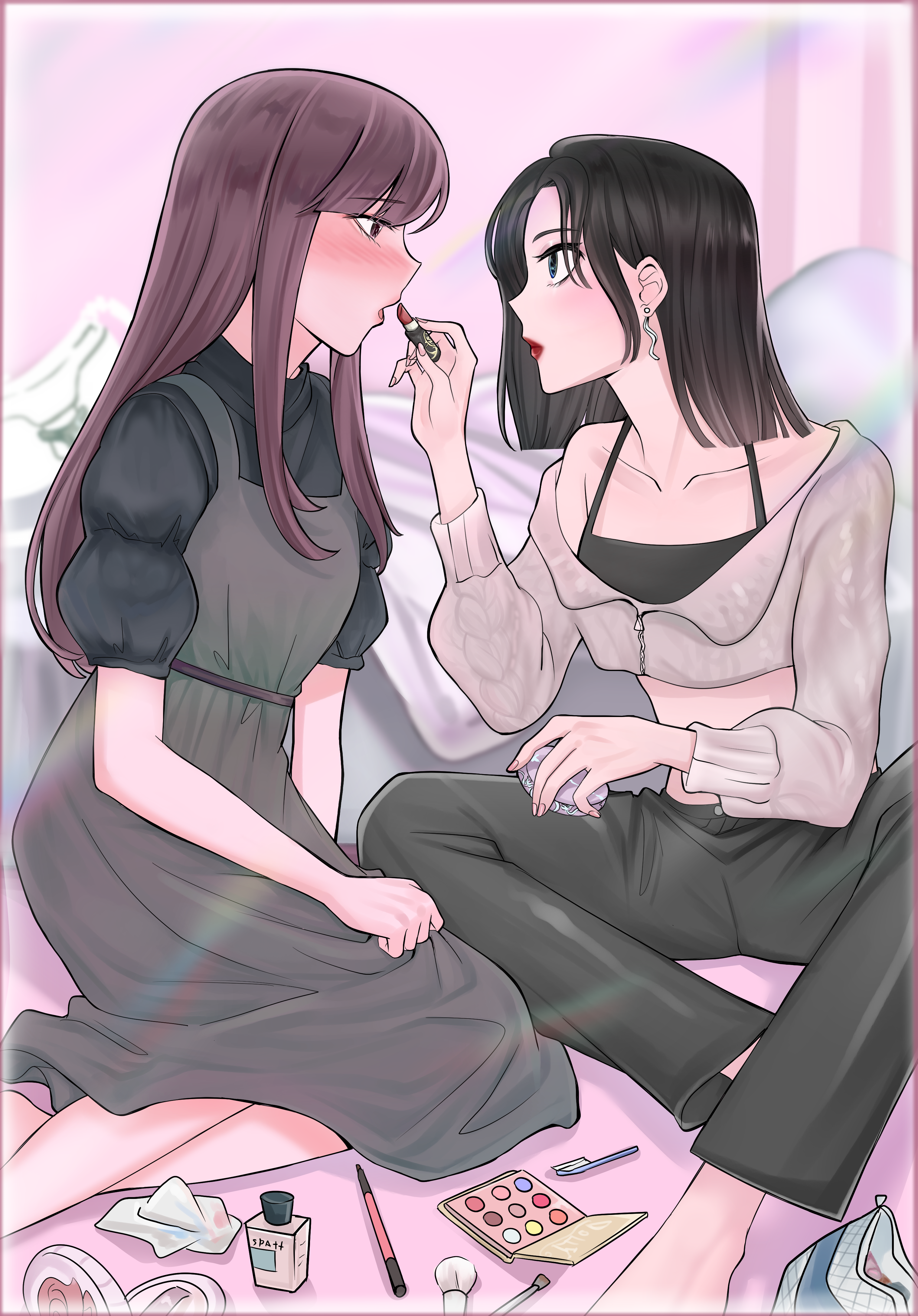2girls absurdres applying_lipstick applying_makeup barefoot bedroom black_camisole black_eyes black_hair black_pants black_shirt blush brown_eyes brown_hair camisole chinese_commentary commentary_request cosmetics dress earrings eye_contact grey_dress highres holding holding_lipstick_tube jacket jewelry lipstick_tube looking_at_another makeup_brush makeup_palette multiple_girls muwei_(v0ptr) original paint_palette pants red_lips shirt sitting tissue white_jacket yuri