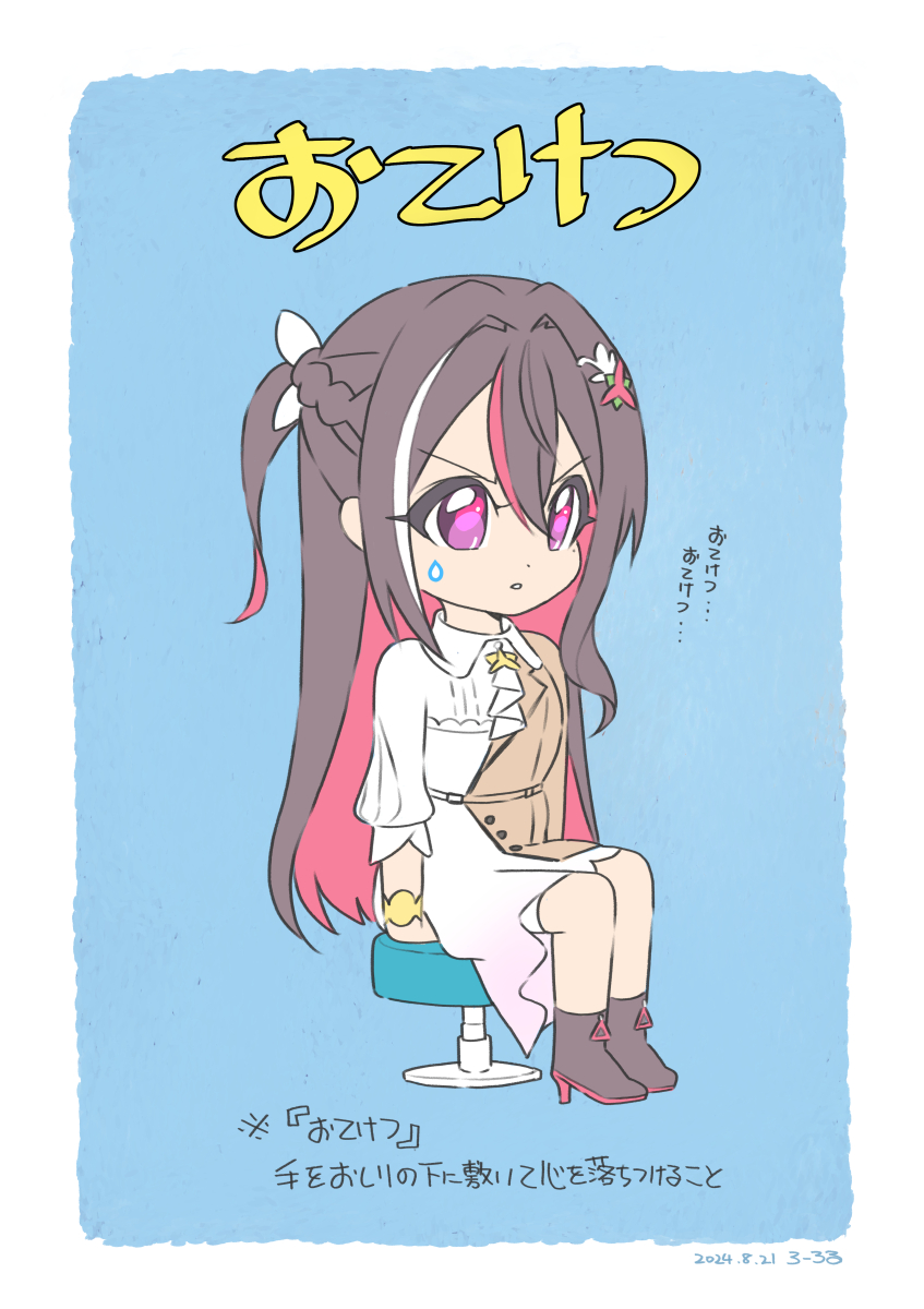 1girl ankle_boots artist_name ascot azki_(4th_costume)_(hololive) azki_(hololive) blue_background boots border braid breasts brown_hair brown_jacket collared_dress colored_inner_hair commentary_request dated deformed double-parted_bangs dress eyelashes flower full_body gradient_clothes gradient_dress grey_boots hair_between_eyes hair_flower hair_intakes hair_ornament half-jacket half_up_braid half_up_half_down_braid high-low_dress high_heel_boots high_heels highres hololive jacket laurol_azuki legs_together long_bangs long_hair looking_ahead mole mole_under_eye multicolored_hair on_stool parted_lips pink_dress purple_eyes short_sleeves signature sitting sitting_on_own_hands solo stool streaked_hair sweatdrop translation_request two-tone_dress v-shaped_eyebrows very_long_hair virtual_youtuber white_ascot white_border white_dress white_hair