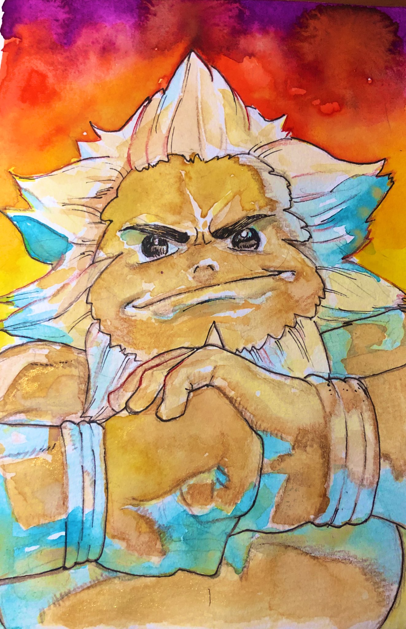 1boy beard black_eyes bracelet cracking_knuckles dancho_no_mori darunia facial_hair goron highres jewelry nintendo painting_(medium) red_background smile solo the_legend_of_zelda the_legend_of_zelda:_ocarina_of_time traditional_media watercolor_(medium) white_hair