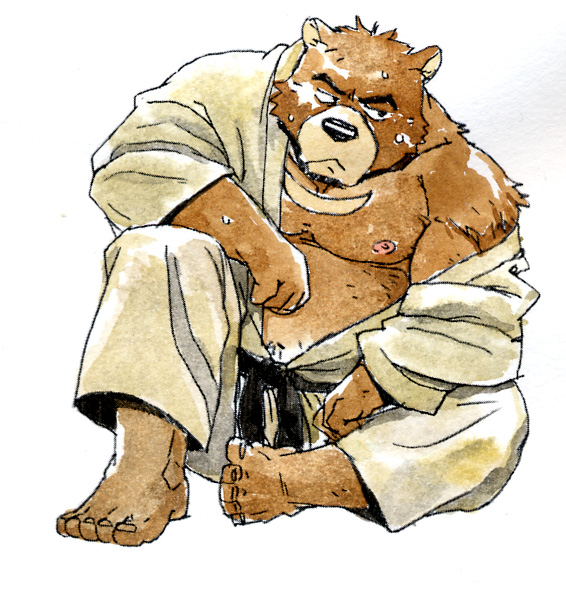 1boy animal_ears arm_on_own_leg bara barefoot bear_boy bear_ears belly belt black_belt brown_fur dougi fat fat_man furry furry_male gamma_dh juuichi_mikazuki looking_to_the_side male_focus morenatsu nipples pectoral_cleavage pectorals sitting sweat very_sweaty white_background