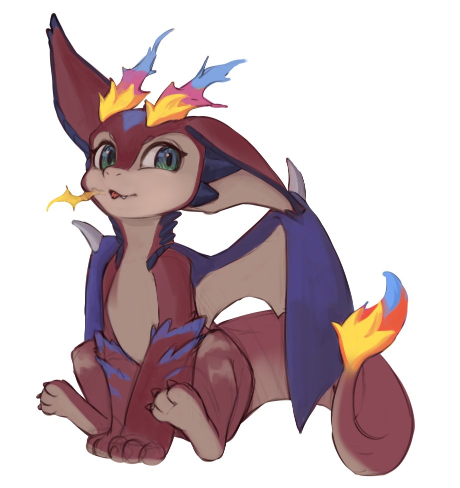 breath_weapon breathing_fire commentary dragon english_commentary ensterart fire flame-tipped_tail full_body green_eyes league_of_legends looking_at_viewer no_humans simple_background one_ear_down sitting smolder_(league_of_legends) tail white_background
