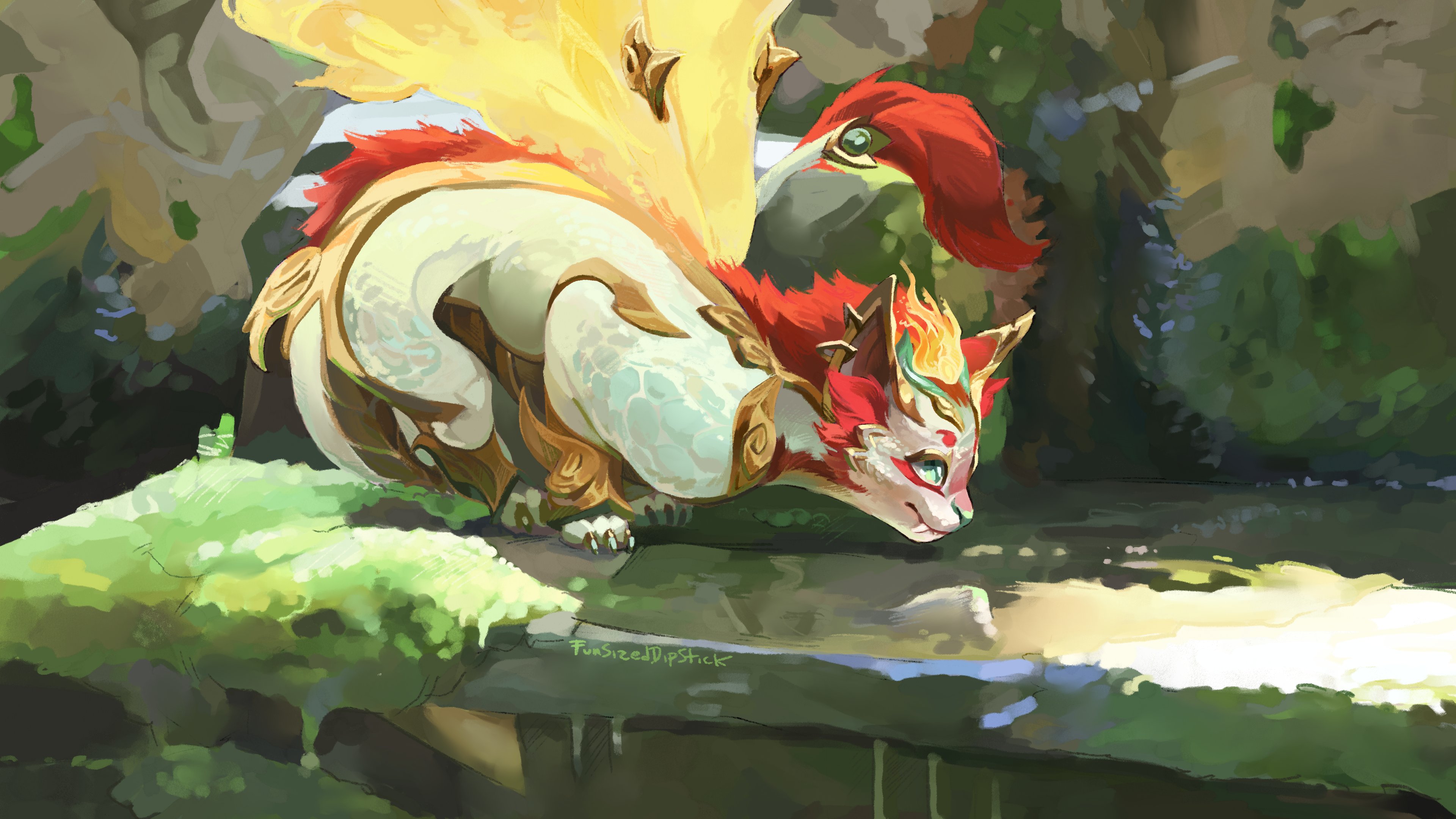absurdres commentary dragon english_commentary fiery_wings full_body funsizedipstick green_eyes heavenscale_smolder heavenscale_smolder_(league_of_legends) highres league_of_legends no_humans outdoors smolder_(league_of_legends) squatting wings