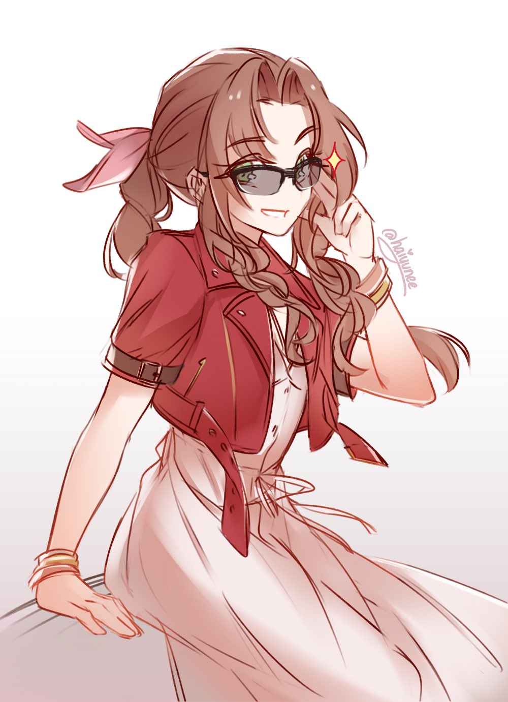 1girl adjusting_eyewear aerith_gainsborough bangle bracelet braid braided_ponytail brown_hair commentary cropped_jacket dress english_commentary final_fantasy final_fantasy_vii final_fantasy_vii_rebirth final_fantasy_vii_remake green_eyes grin hair_ribbon haiyun highres jacket jewelry long_dress long_hair parted_bangs pink_dress pink_ribbon red_jacket ribbon short_sleeves sidelocks single_braid smile solo sparkle sunglasses twitter_username upper_body
