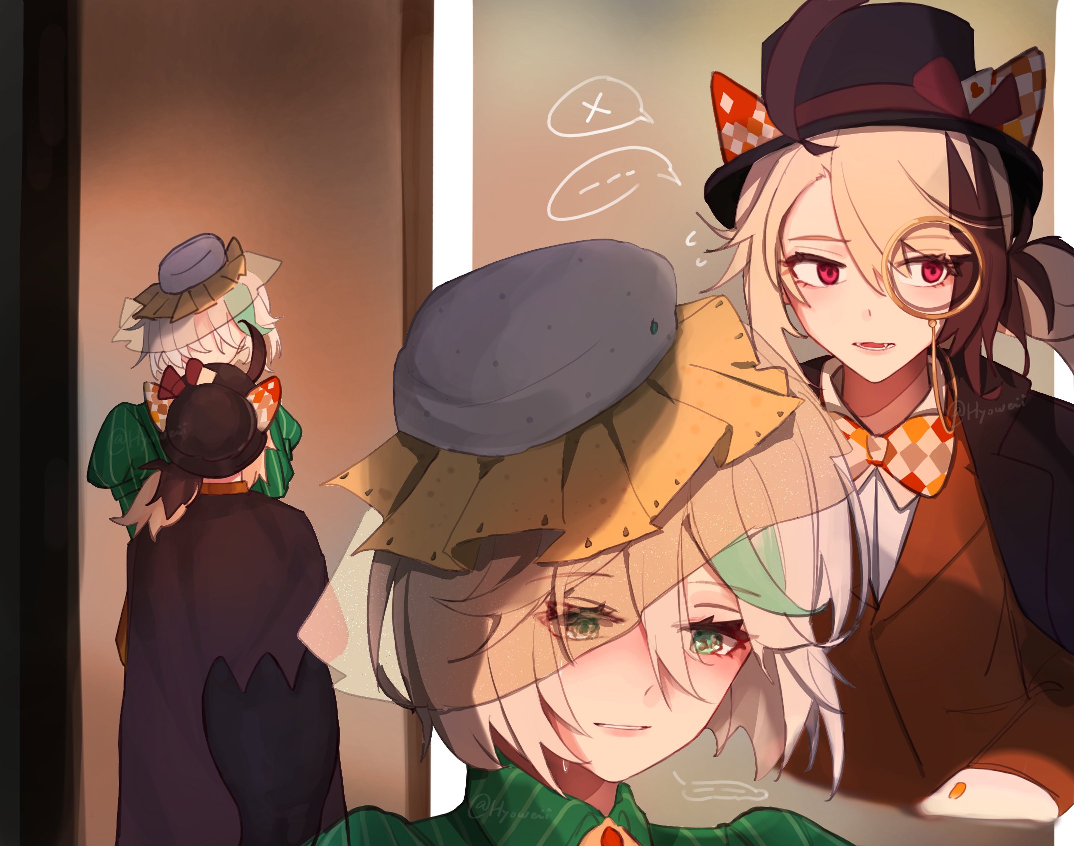 2girls alternate_costume bow brown_hair cecilia_immergreen commentary dress english_commentary gigi_murin green_eyes green_skirt hat highres hololive hololive_english long_hair long_sleeves looking_to_the_side medium_hair multiple_girls ponytail red_eyes skirt smile standing virtual_youtuber weiiyxn white_hair yuri
